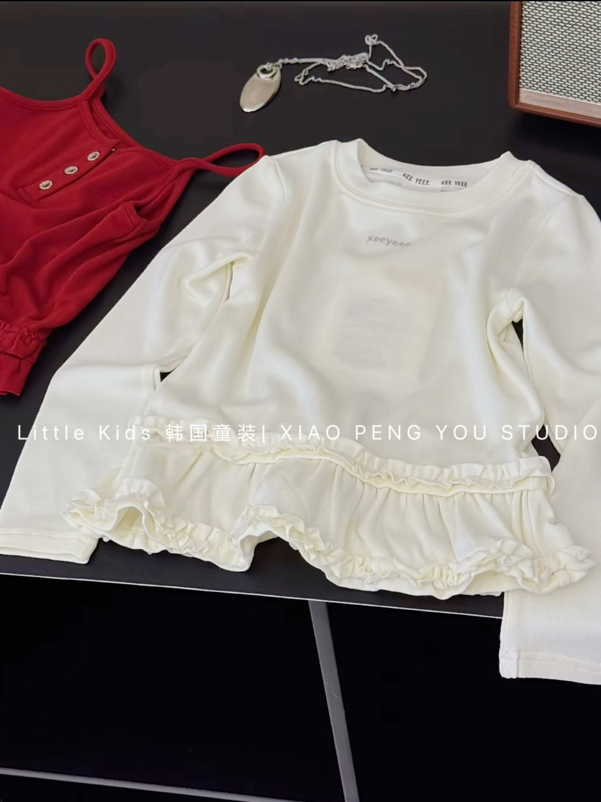 女童长袖t恤春秋装2025韩系女孩木耳边吊带打底衫t两件套叠穿套装