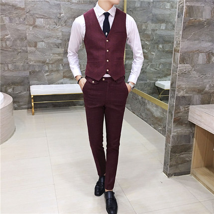 韩版修身休闲格子马甲套装男士西服马夹结婚礼服商务职业潮发型师