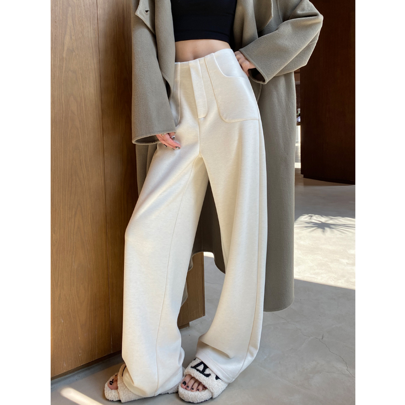 寻笙记羊毛呢加绒米白阔腿裤高腰