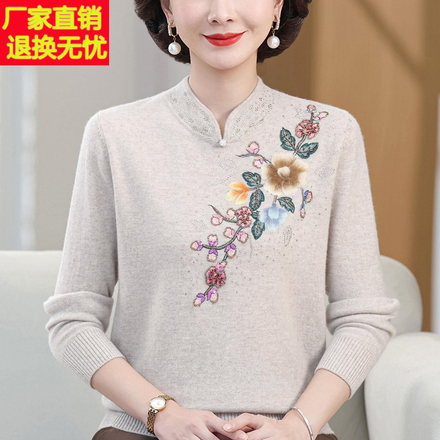 嘉兴濮院市妈妈装纯羊毛衫女旗袍领保暖毛衣秋冬季中老年人打底衫