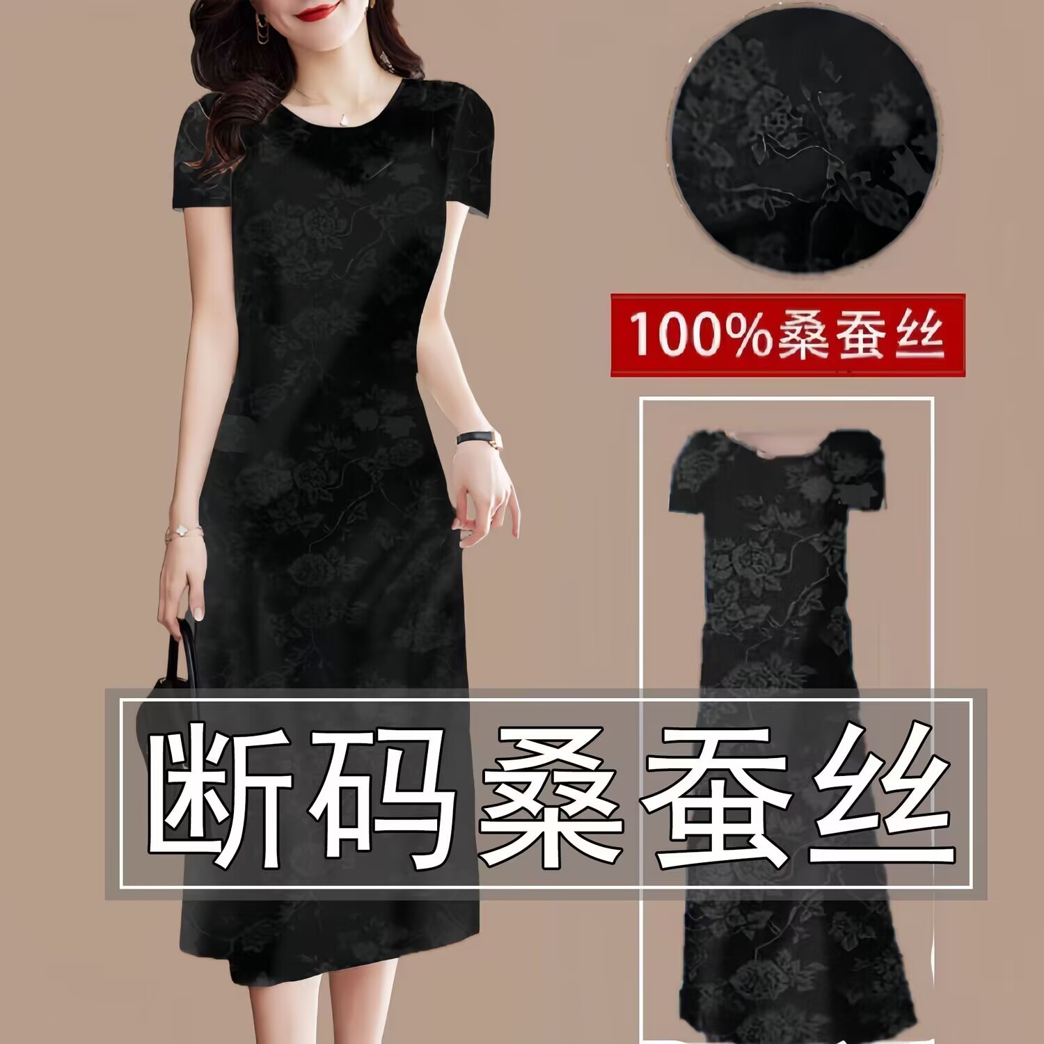 100%桑蚕丝香云纱连衣裙女夏季2023新款宽松大码中老年妈妈中长裙