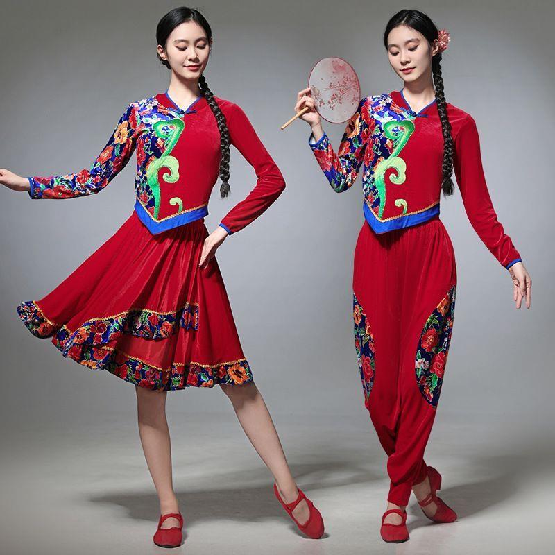 金丝绒广场舞服装新款秋冬季长袖现代民族风舞蹈连衣裙套装演出服