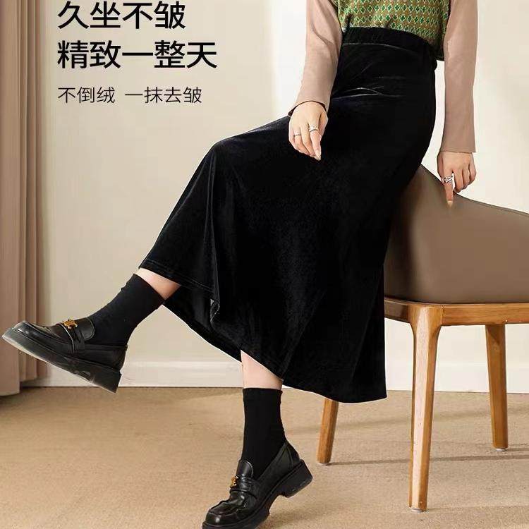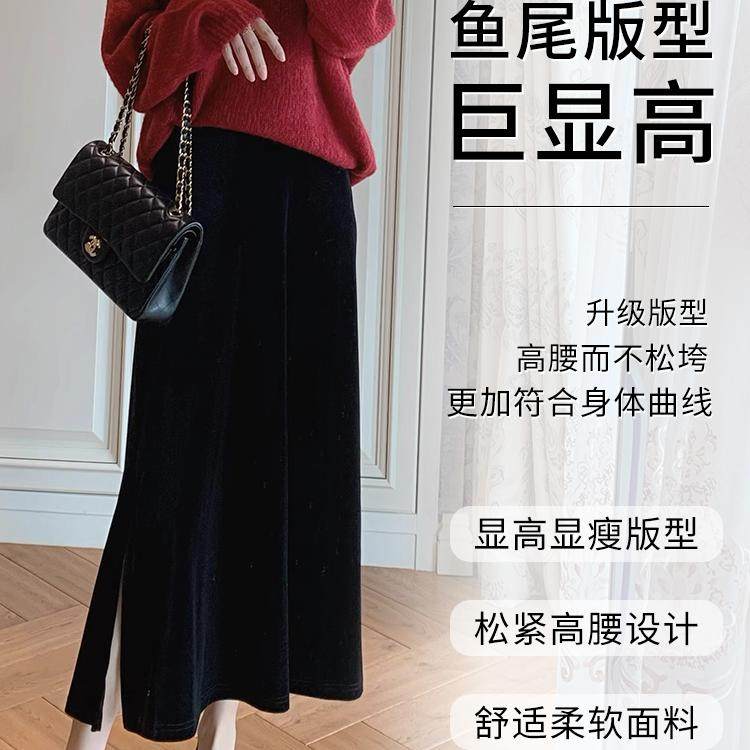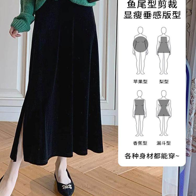 金丝绒半身裙女秋冬黑色垂感洋气复古a字裙 大码开叉中长款鱼尾裙