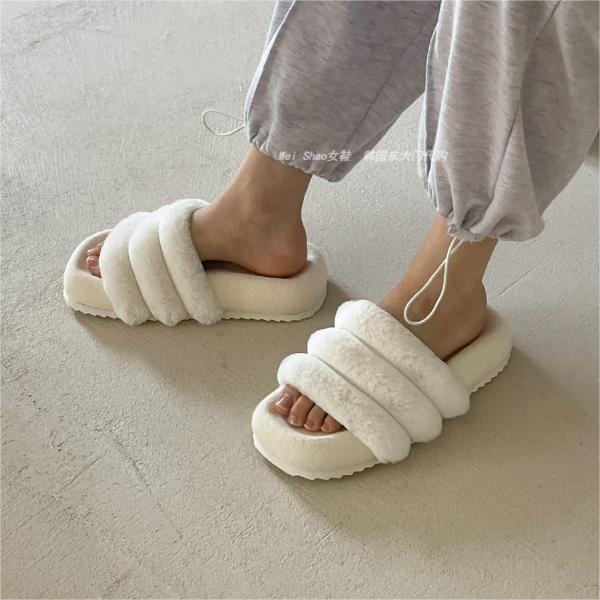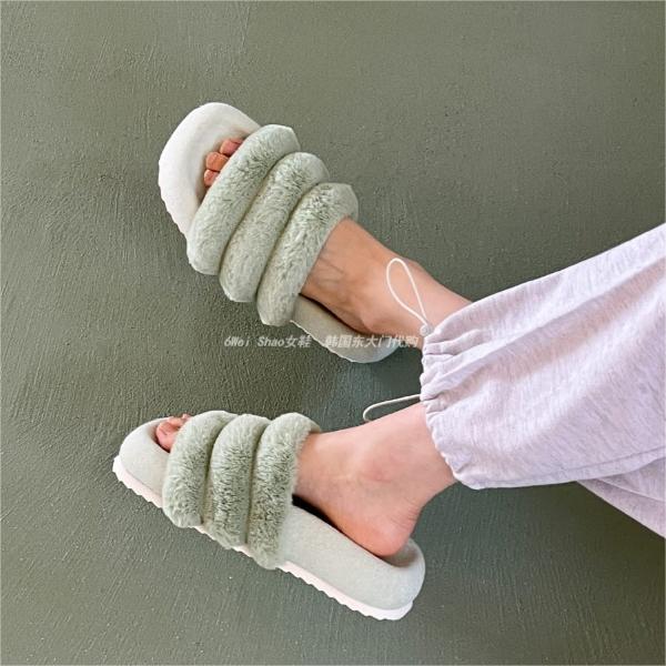 韩国东大门代购正品秋冬减龄小清新舒适百搭一字露趾厚底毛毛拖鞋