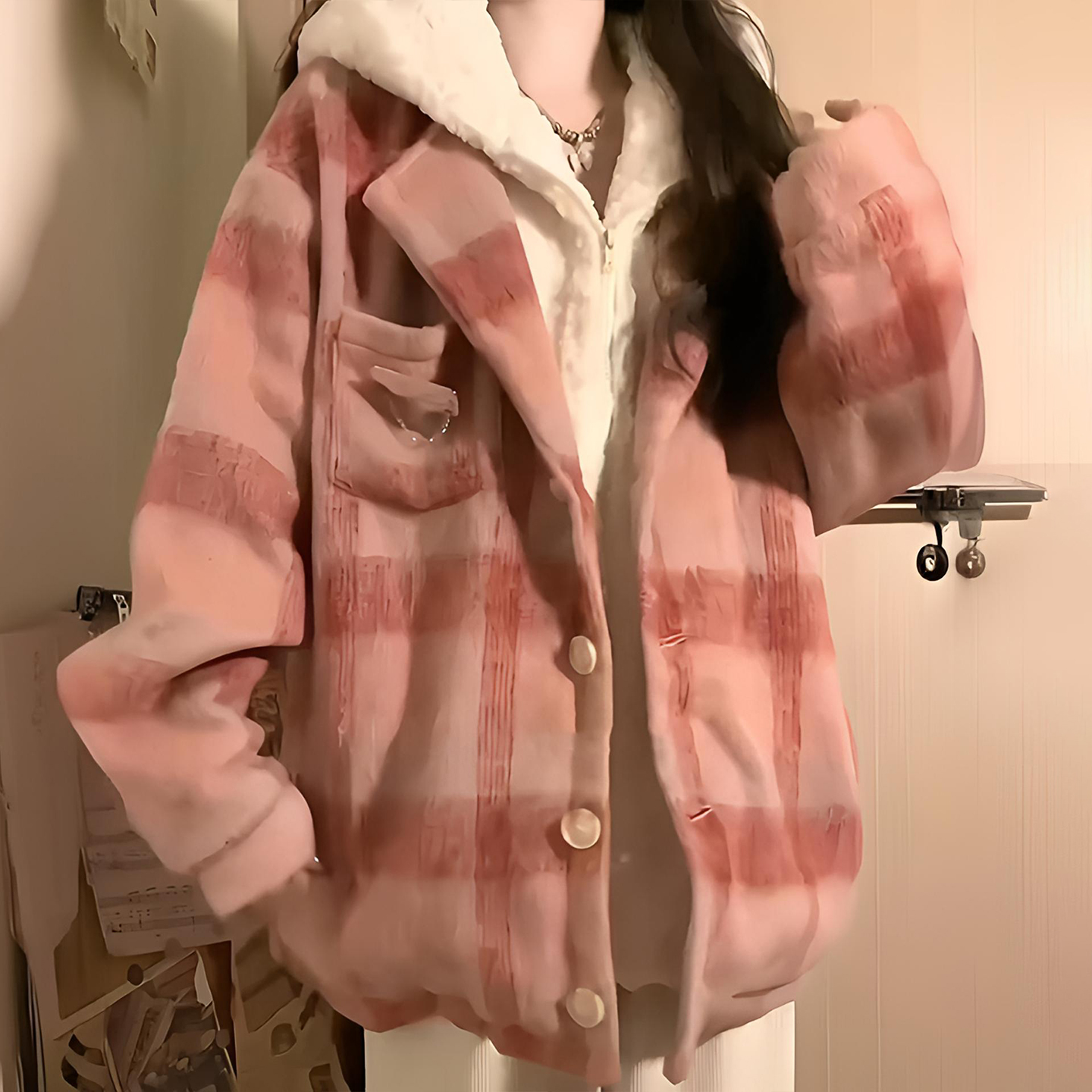 大码女装胖mm红色格子毛呢外套女冬季加厚保暖假两件连帽棉服上衣
