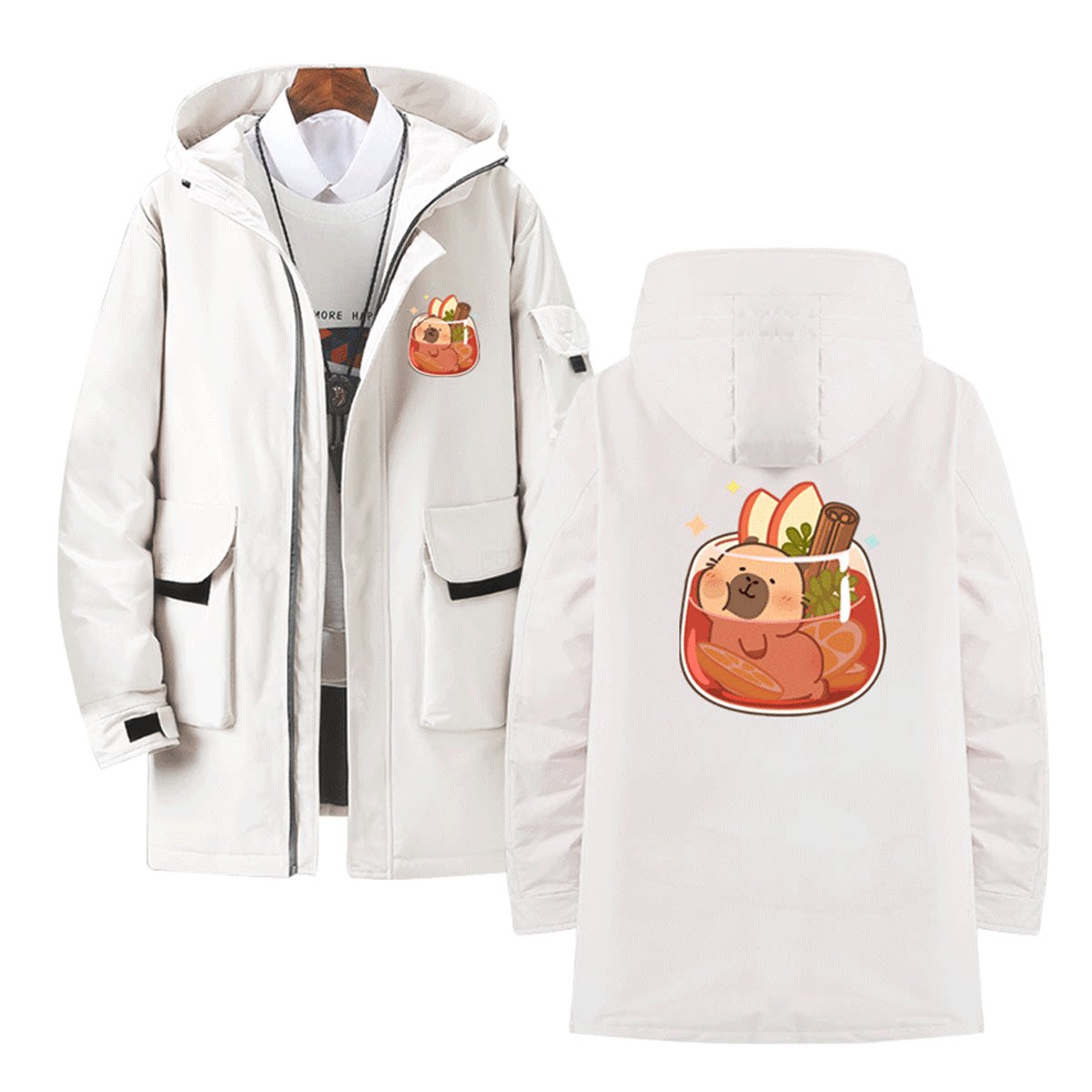 卡皮巴拉水豚君周边日系卡通男女秋冬可定制连帽外套中长款羽绒服