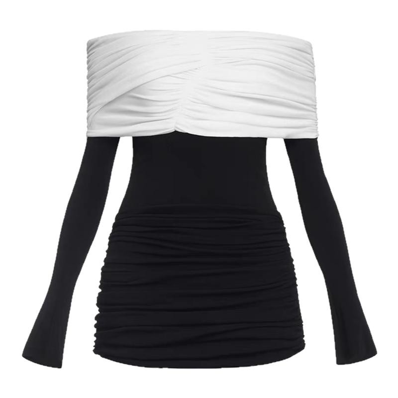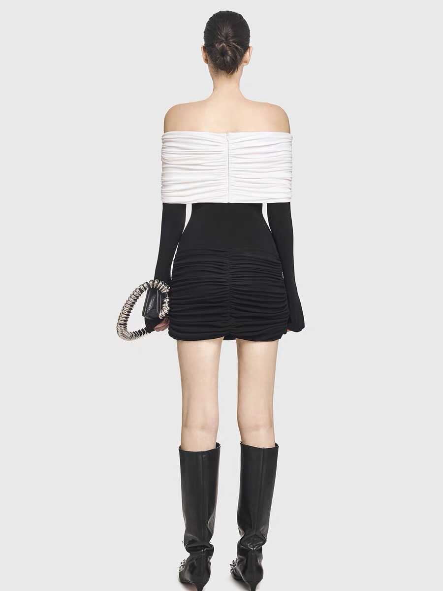越南小众设计师黑白撞色修身褶皱短裙一字肩弹力长袖包臀裙连衣裙