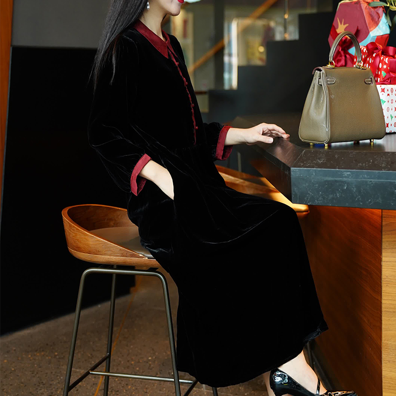 2023年新款春秋季时尚丝绒女士连衣裙气质真丝妈妈翻领桑蚕丝裙子