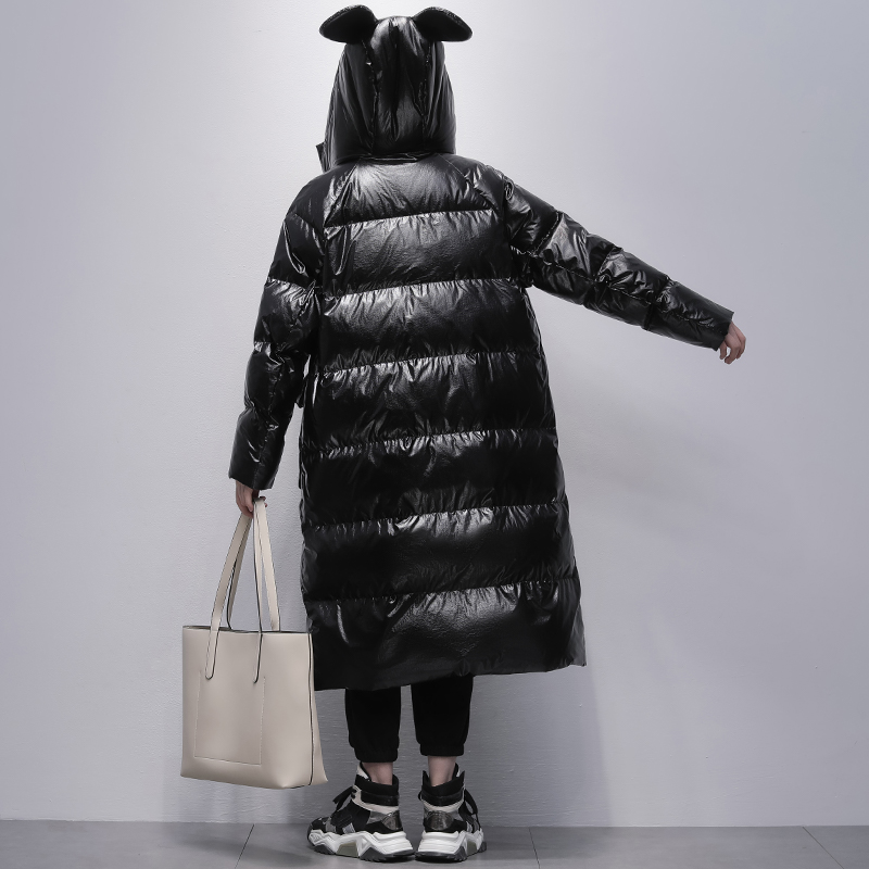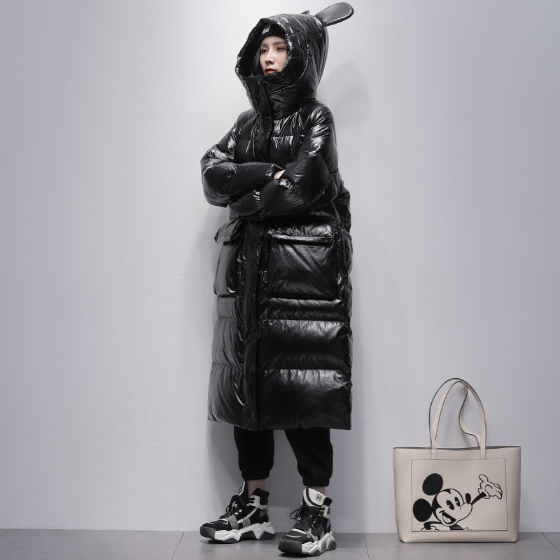 黑色亮面羽绒服女中长款2025冬季新款韩版连帽过膝白鸭绒加厚外套