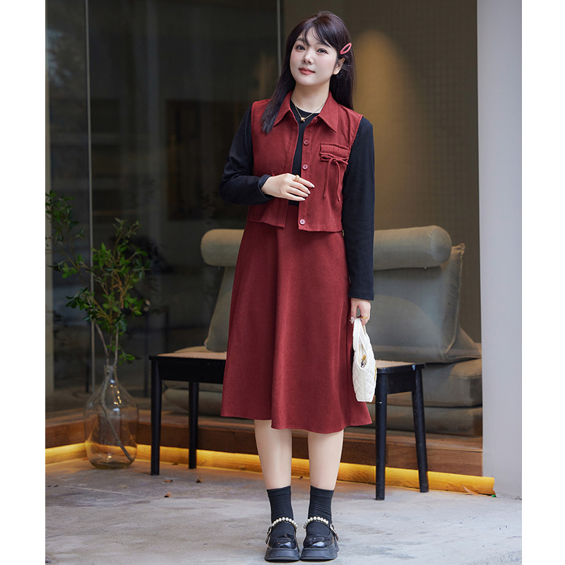 绮娑显瘦大码两件套装胖mm连衣裙秋冬新款马甲外套针织磨毛A字裙