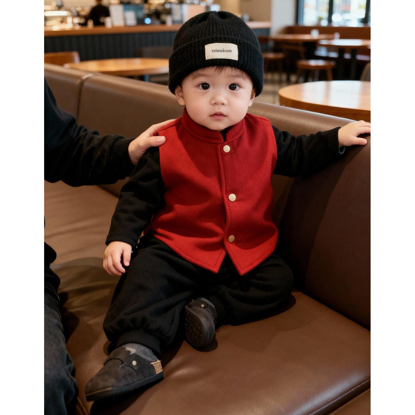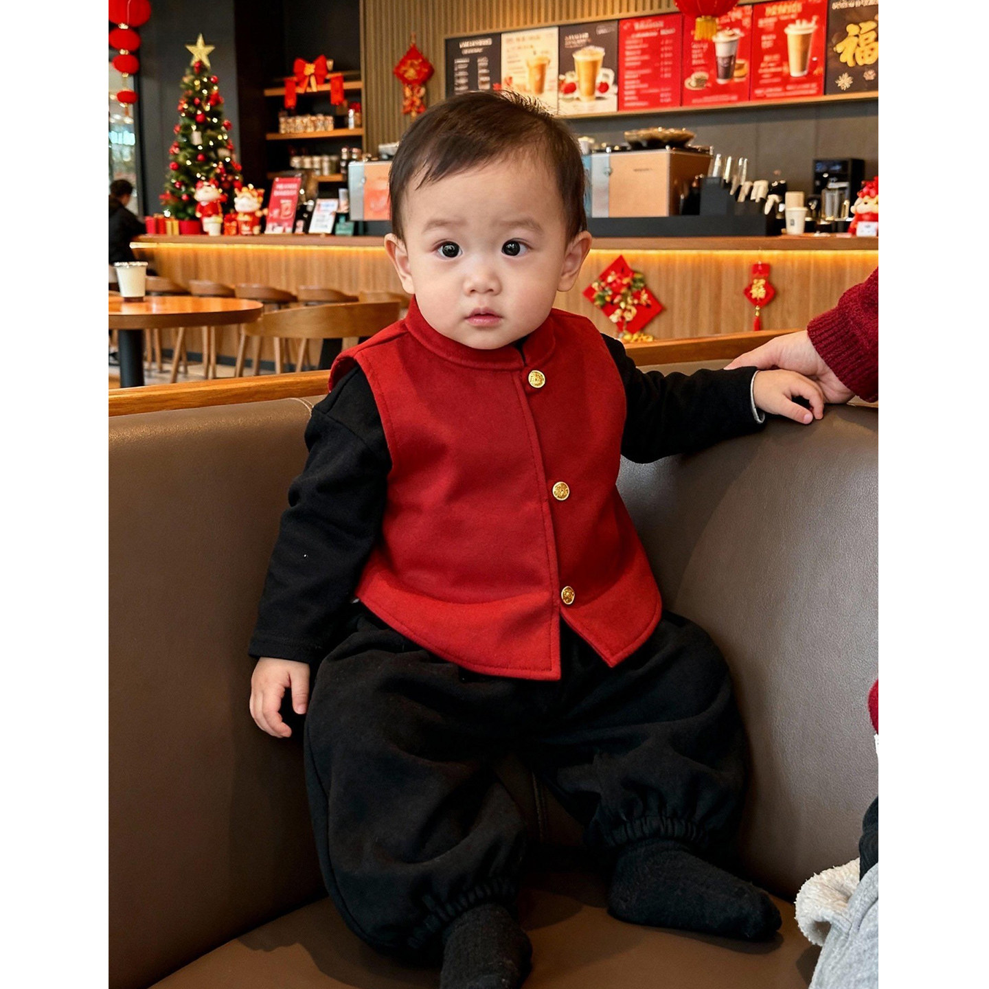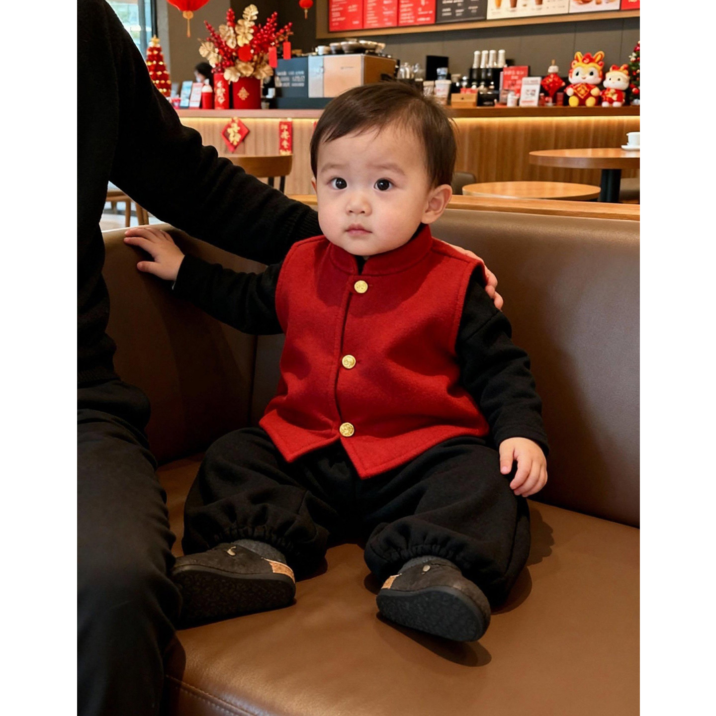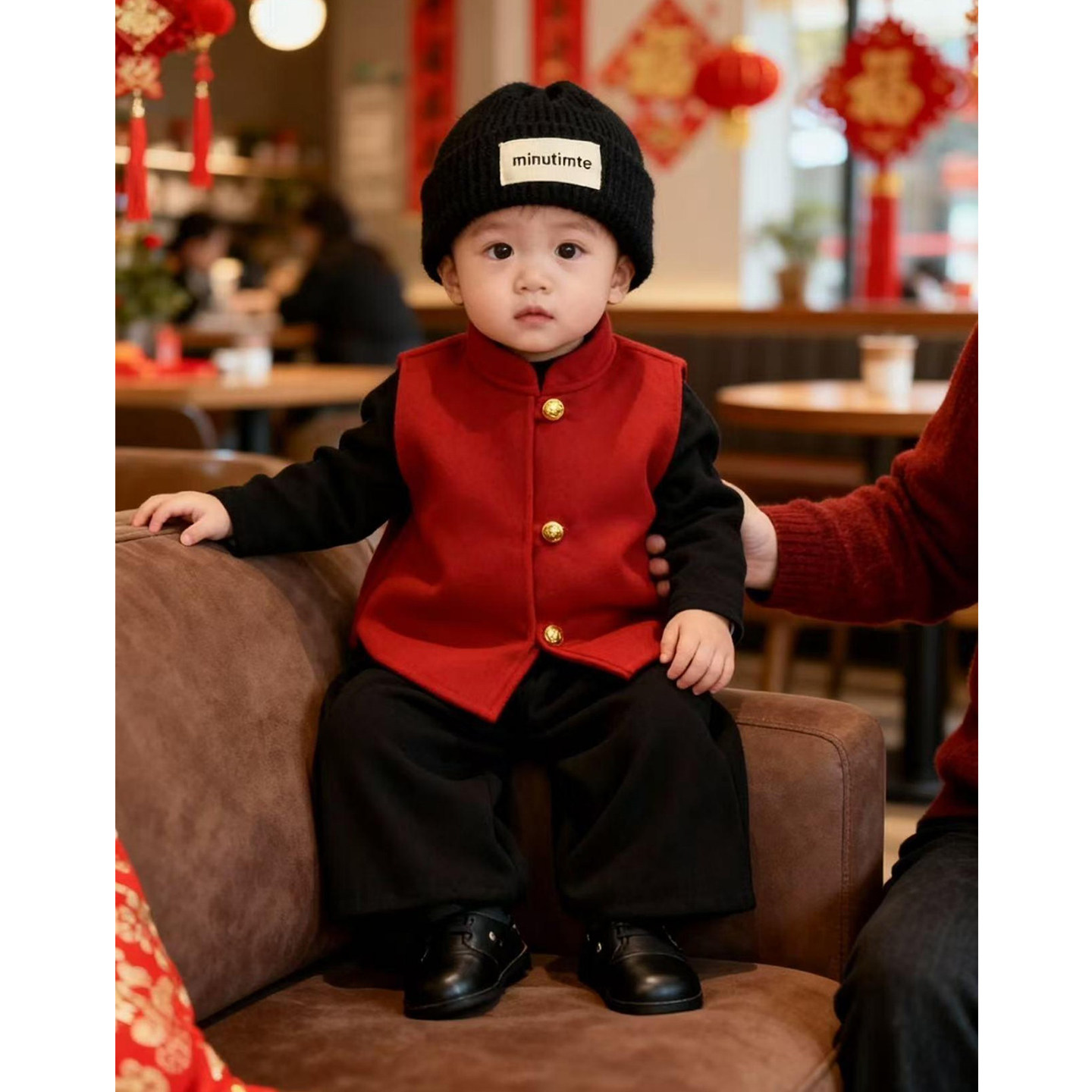 婴儿红色新年马甲三件套新中式毛呢加厚马甲坎肩针织衫套装拜年服