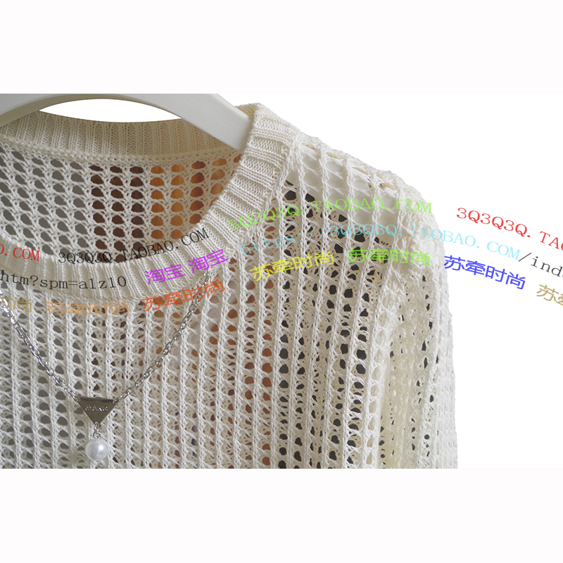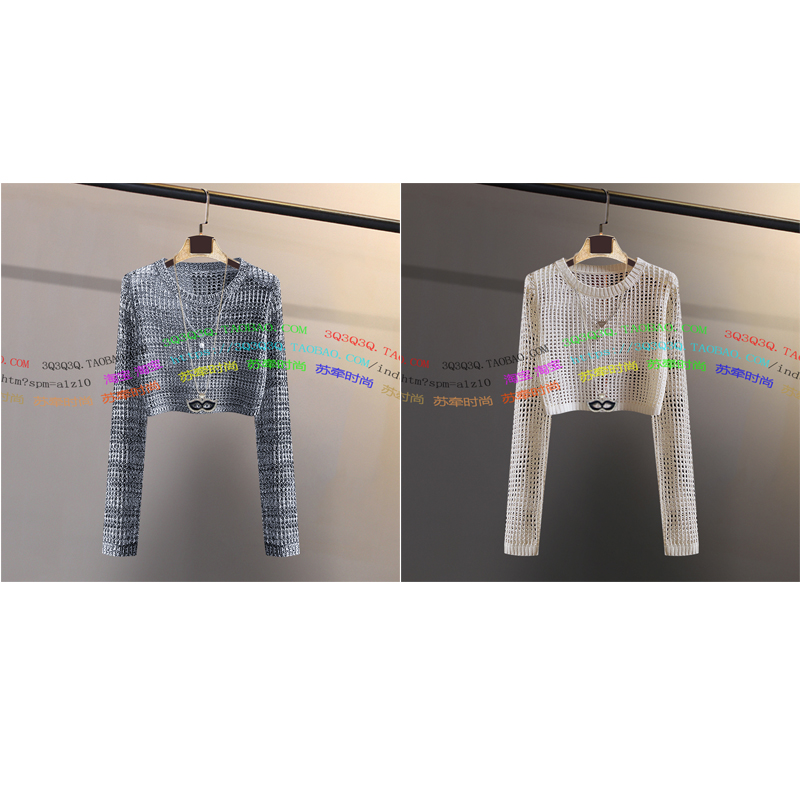 复古挂饰针织衫女夏超短款高腰套头镂空网眼罩衫长袖配裙外搭上衣