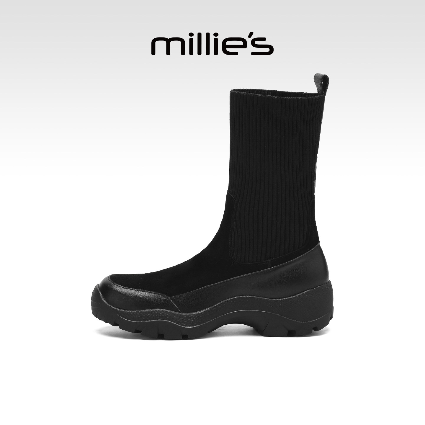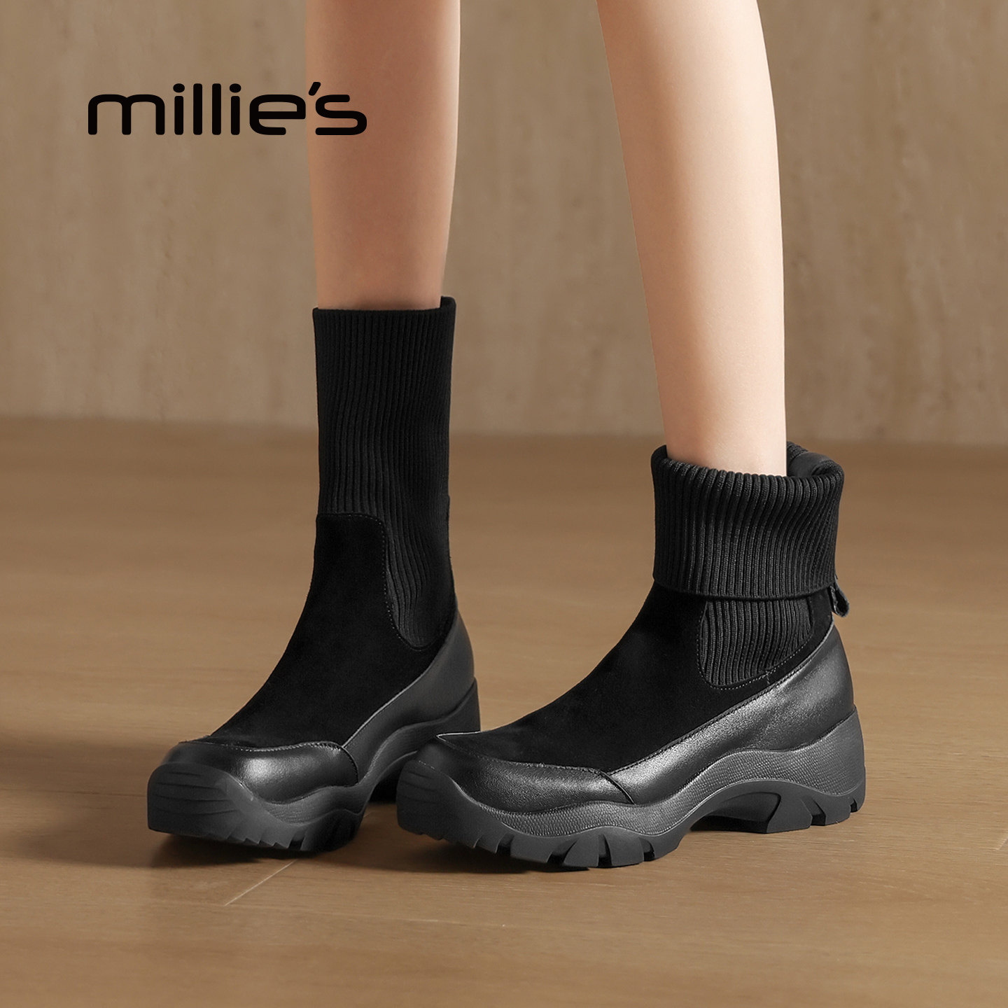millies妙丽女鞋2025年冬季新款厚底弹力靴女靴子加绒保暖瘦瘦靴