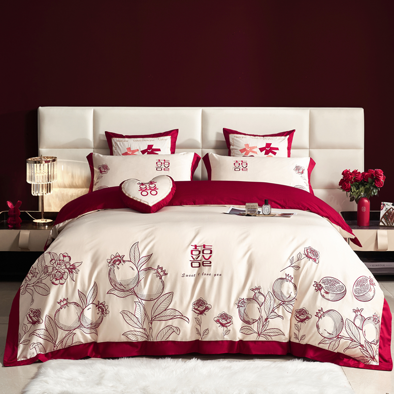 120支长绒棉婚庆四件套全棉酒红色刺绣端结婚房礼床上用品4