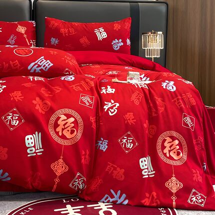 简约新婚庆百福四件套全棉床单大红色被套结婚房陪嫁床上用品