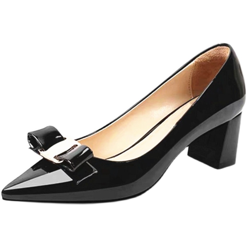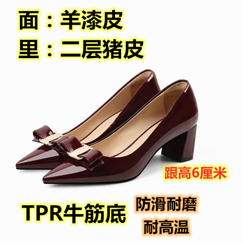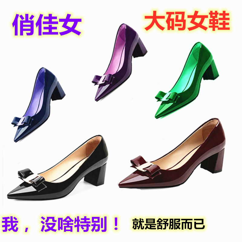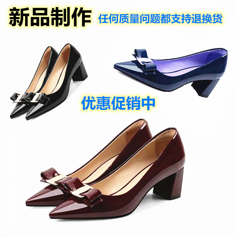 时尚新款纯色尖头浅口粗跟软皮鞋套脚软漆皮黑色真皮大码粗跟单鞋
