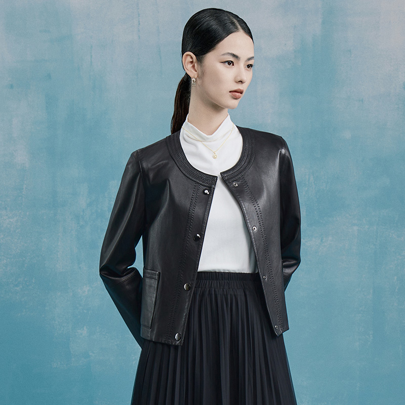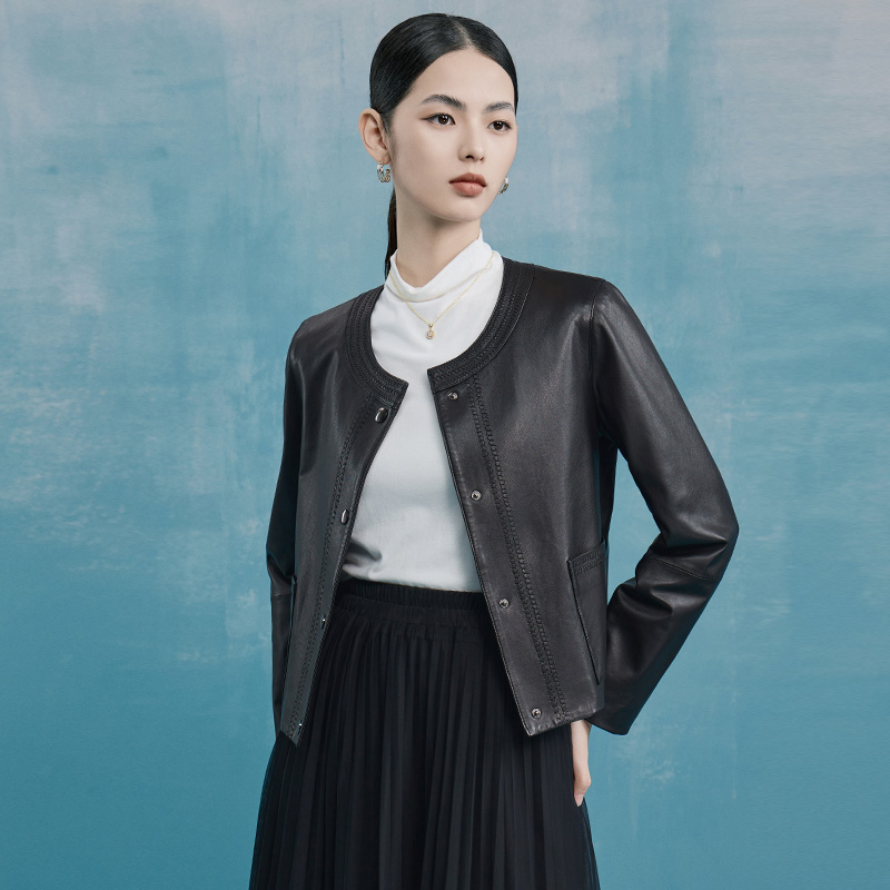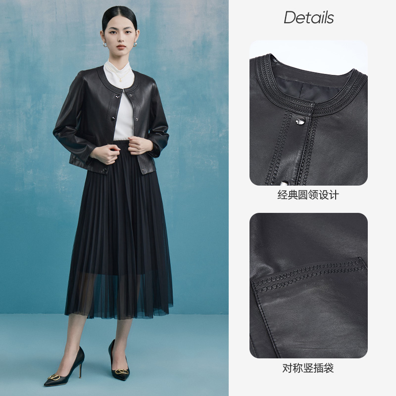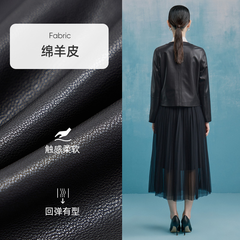 【绵羊皮】马天奴女装黑色短款圆领皮衣简约质感外套外搭春秋新款