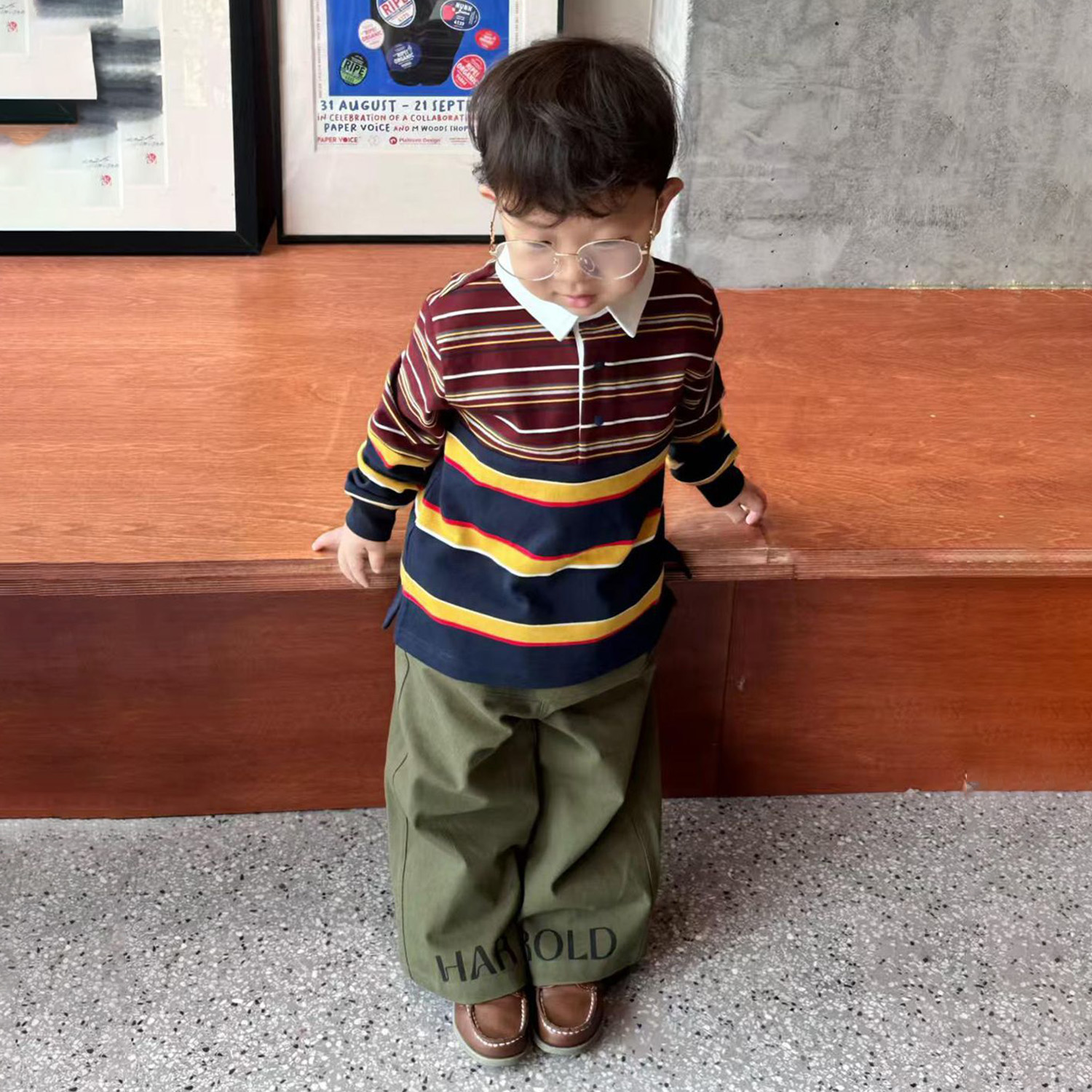 韩版男童2025秋季新款复古撞色条纹polo领长袖T恤儿童休闲阔腿裤