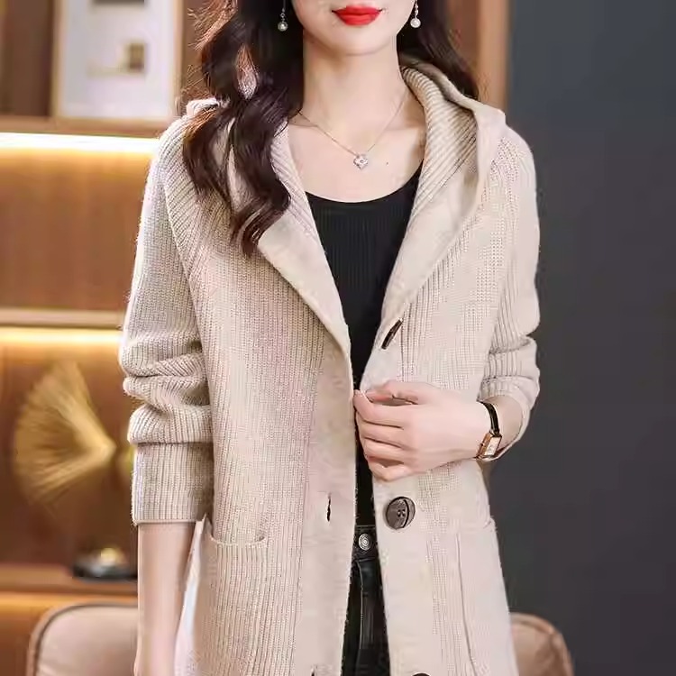 秋冬加厚外套羊绒衫连帽针织开衫女中长款外搭宽松大码专柜羊毛衣