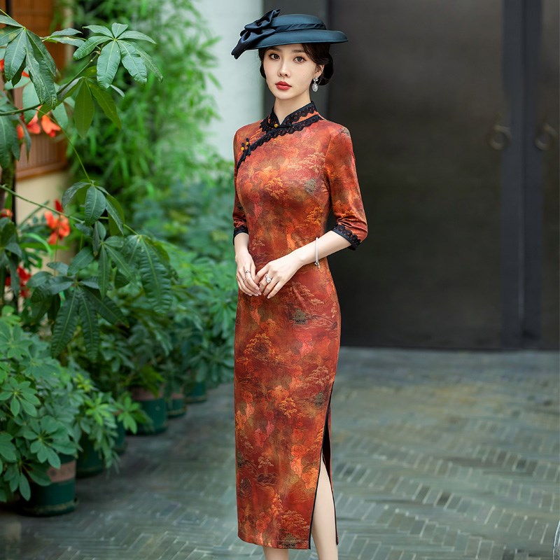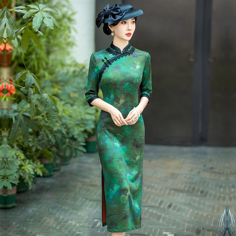 新中式旗袍女春秋复古长款时尚妈妈日常改良修身连衣裙中袖大码裙