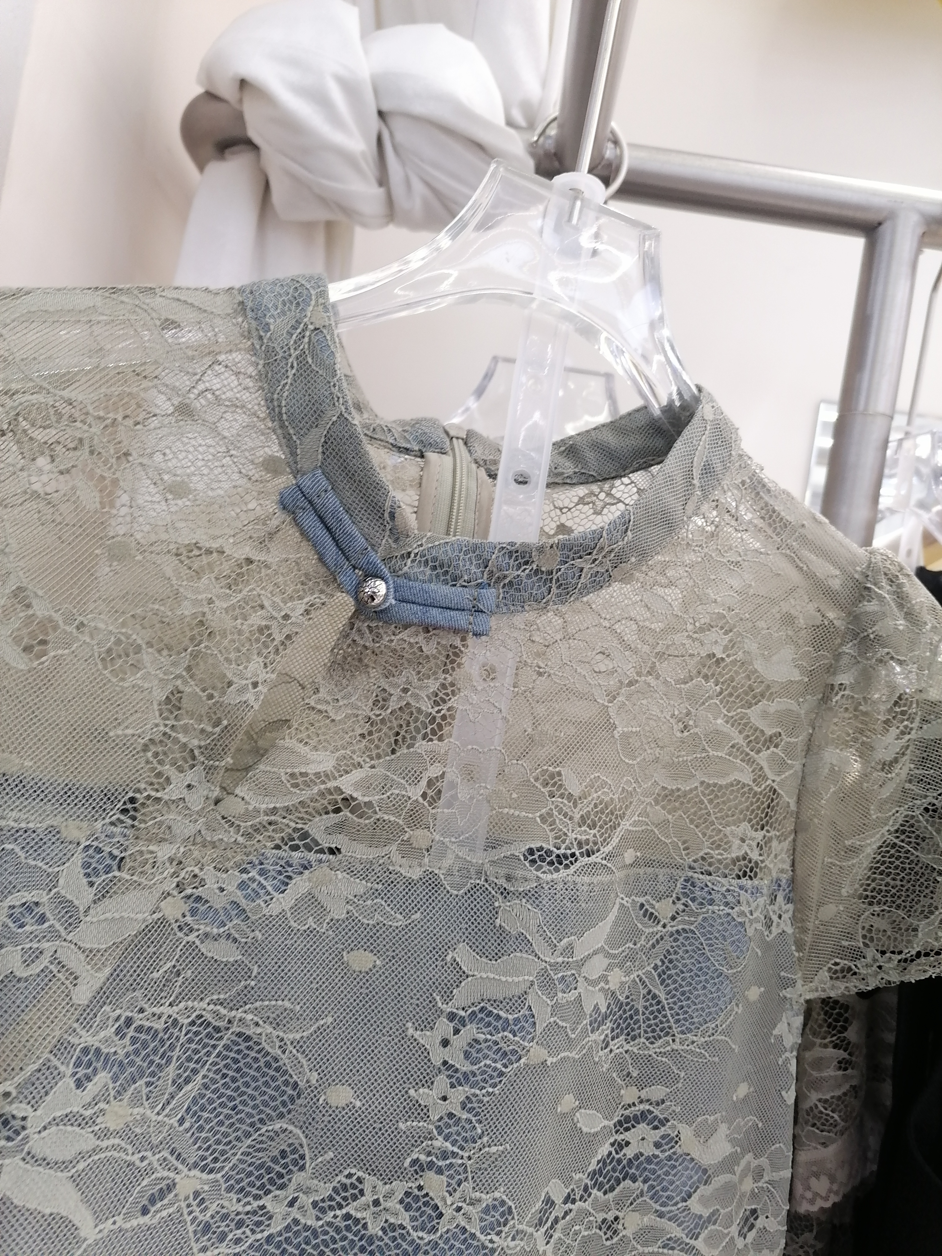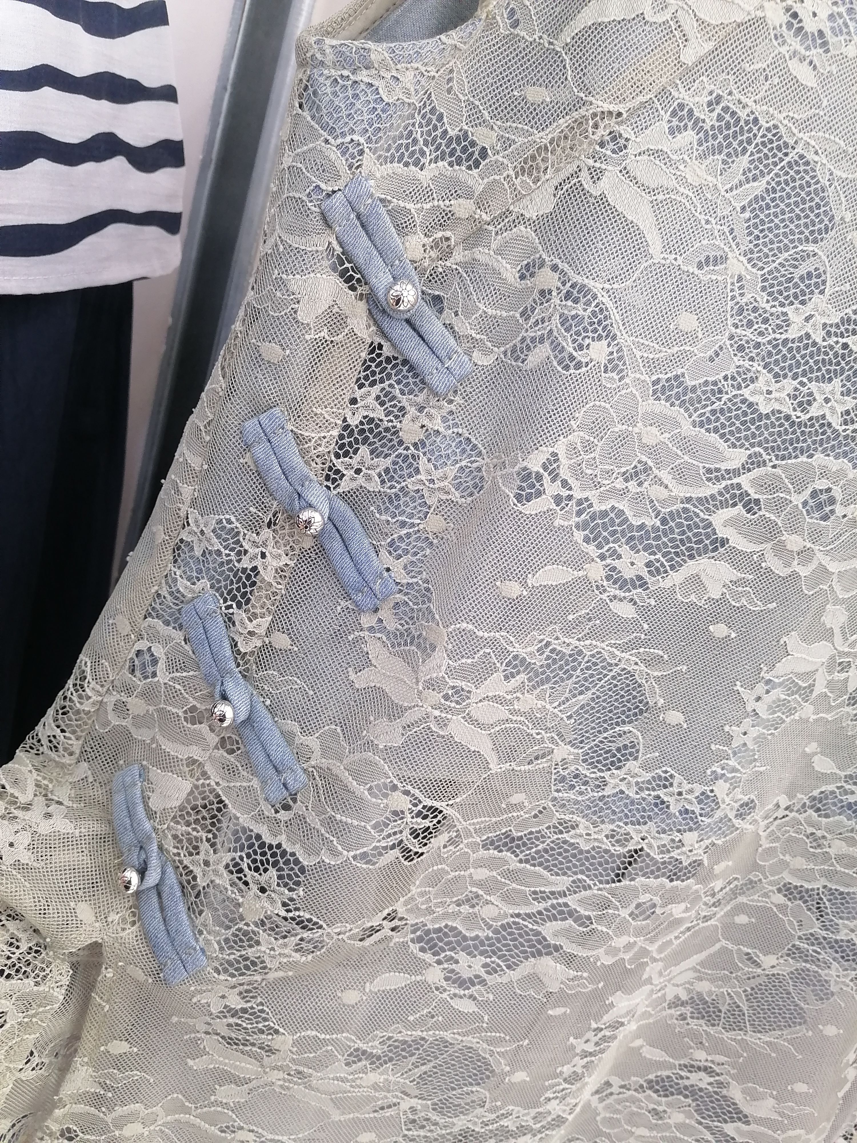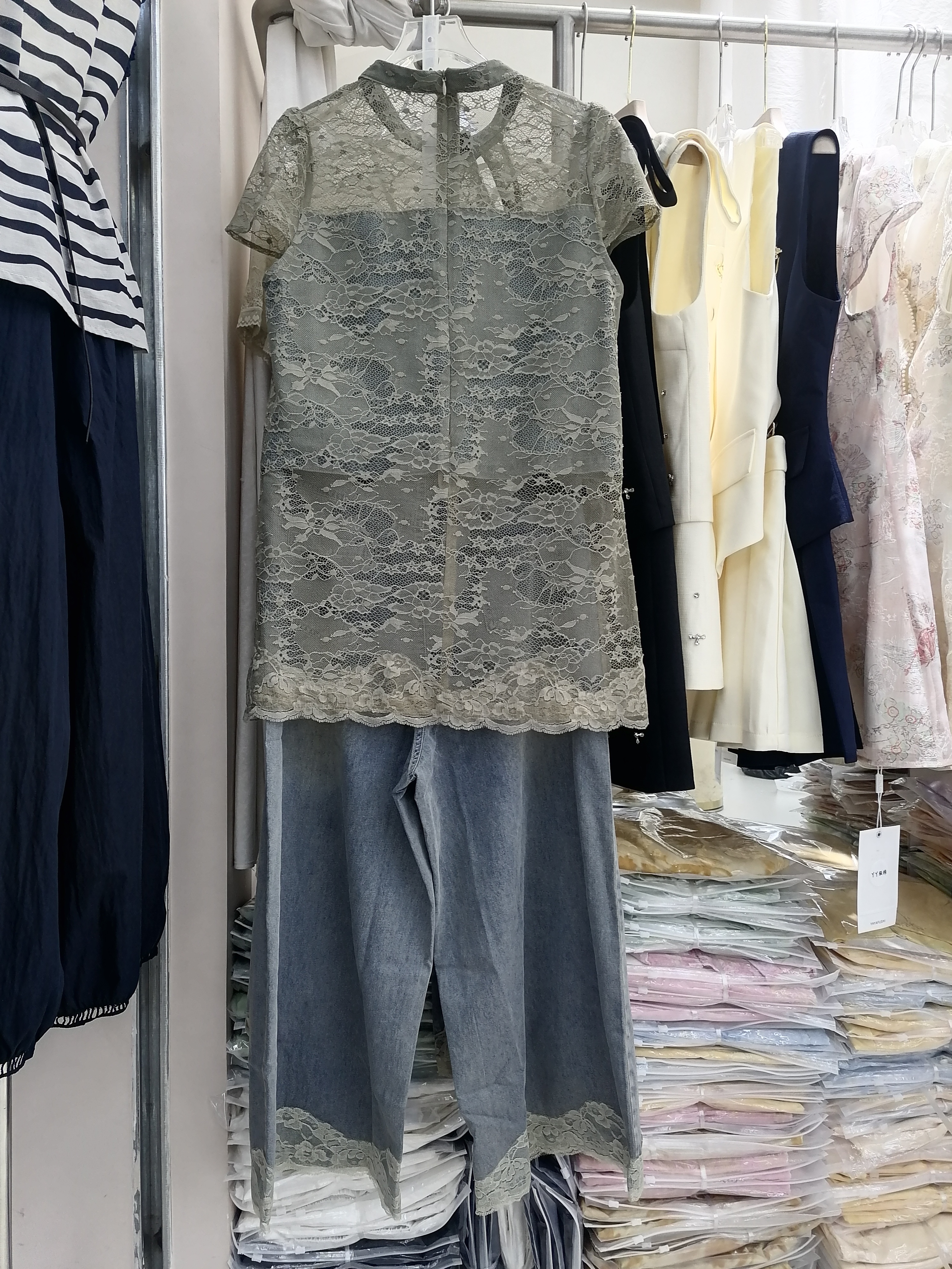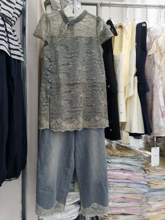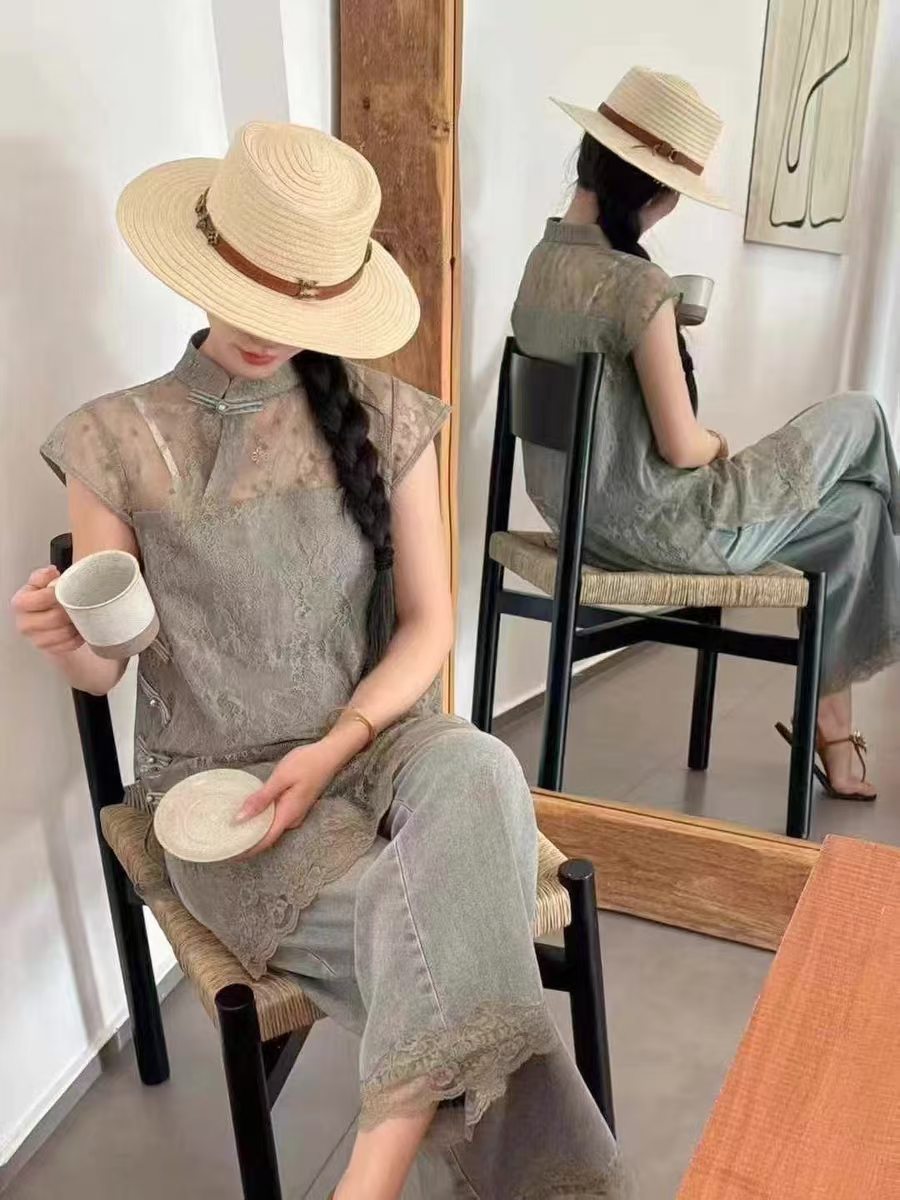 新中式时尚套装女立领盘扣拼牛仔蕾丝上衣+阔腿牛仔裤两件套裤女