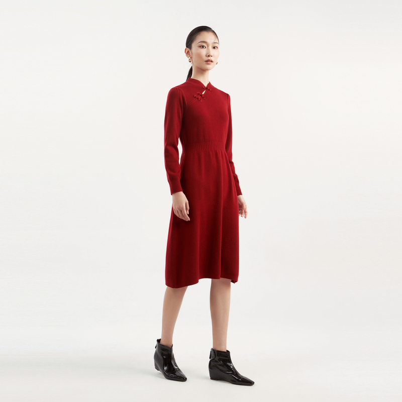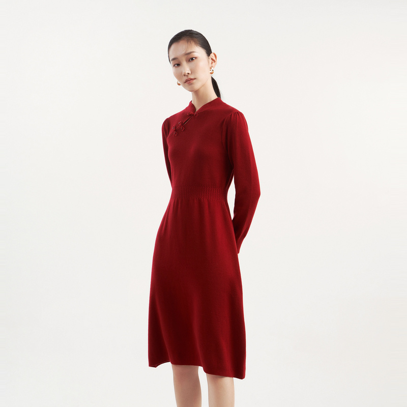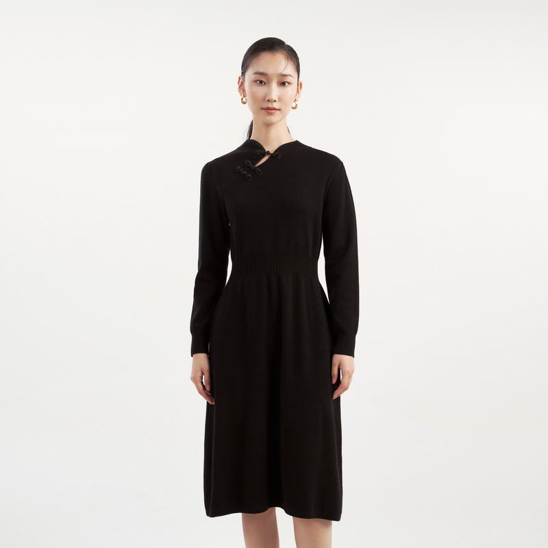 [专柜同款]Yifini/易菲国风新中式小立领盘扣气质长袖毛织连衣裙