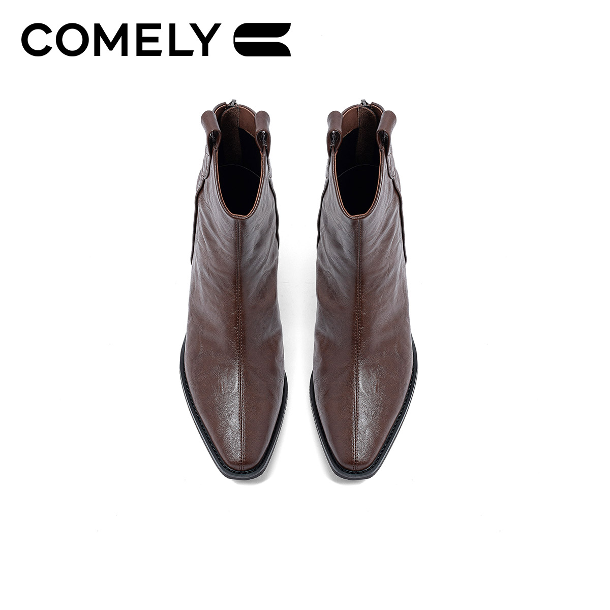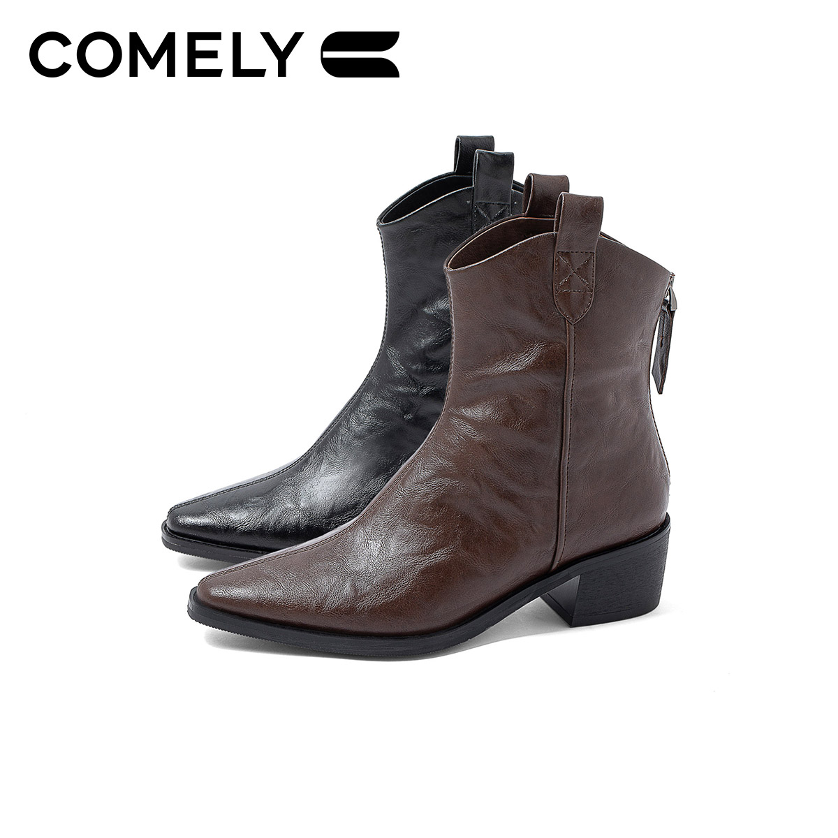 康莉美式西部牛仔靴女冬季新款复古粗跟骑士靴小个子增高短靴