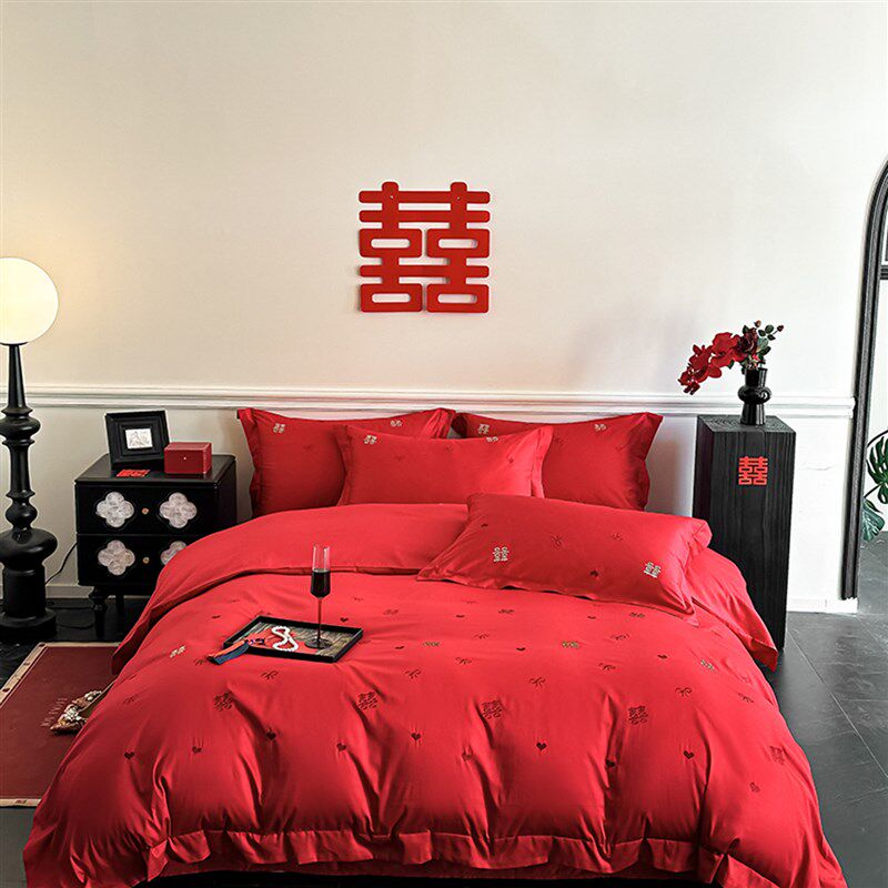 新中式婚庆四件组大红色刺绣被B套新房喜庆床单结婚床上用品