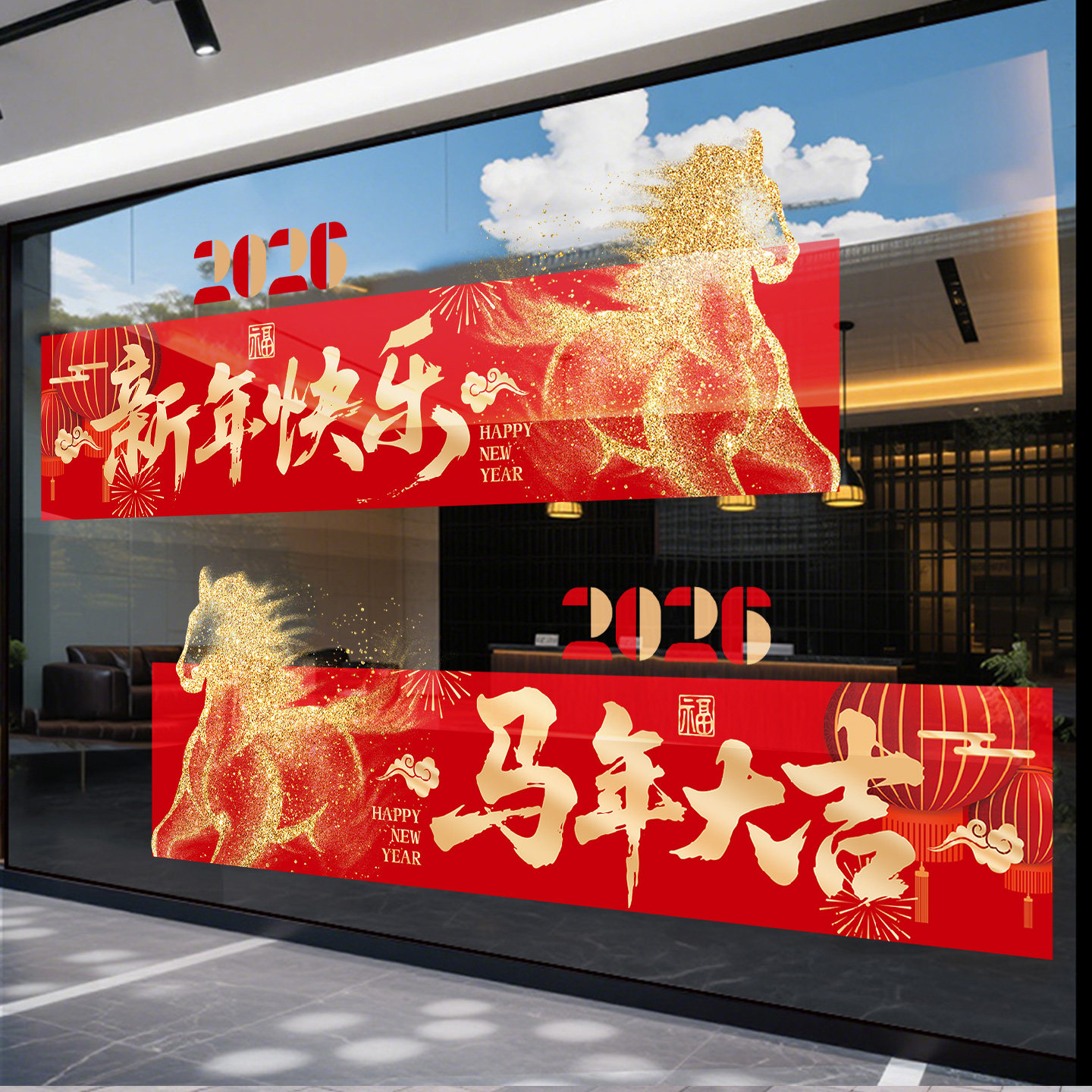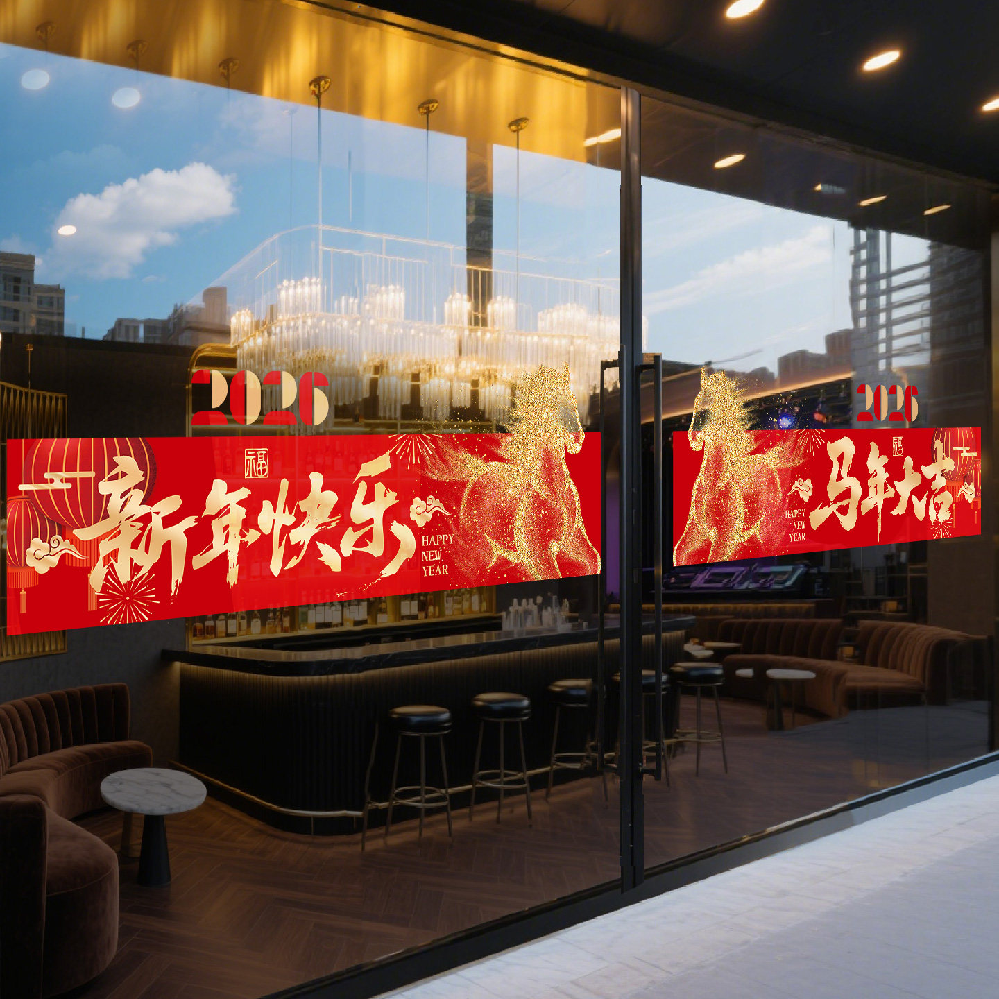 新年装饰玻璃门贴纸防撞条公司店铺饭店2026贺年静电马年氛围布置