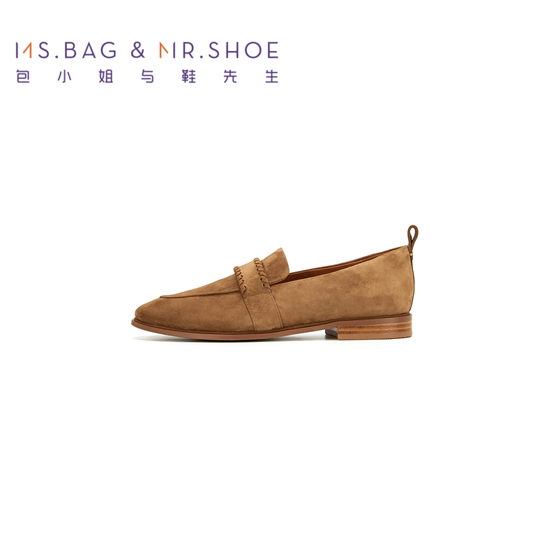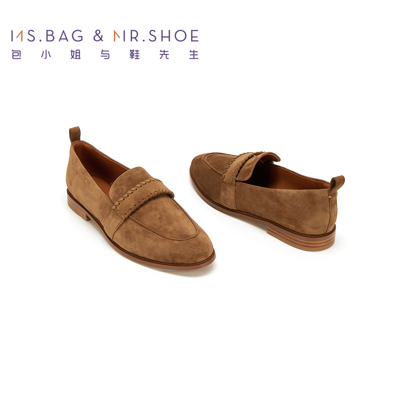 包小姐与鞋先生春秋款复古棕色羊皮穿条平底深口乐福鞋女243337