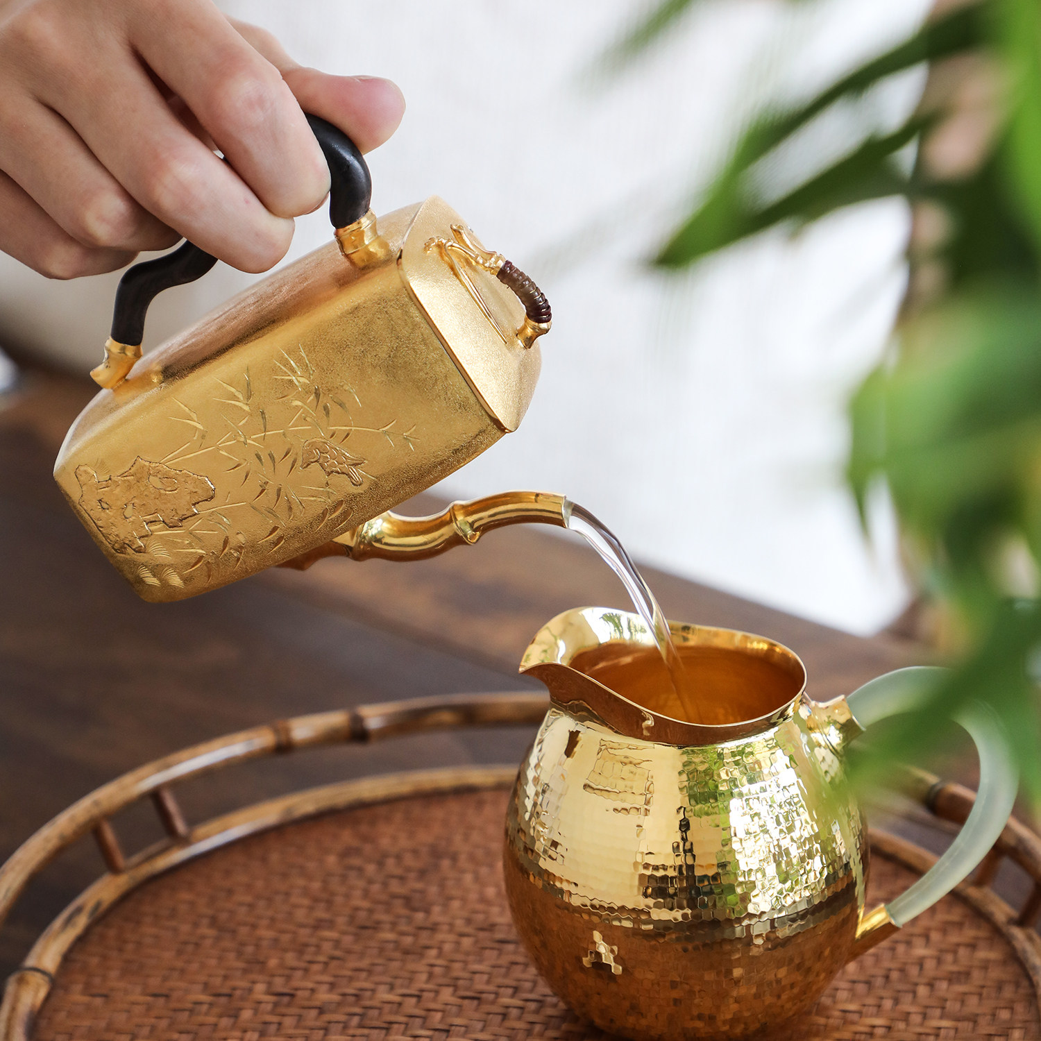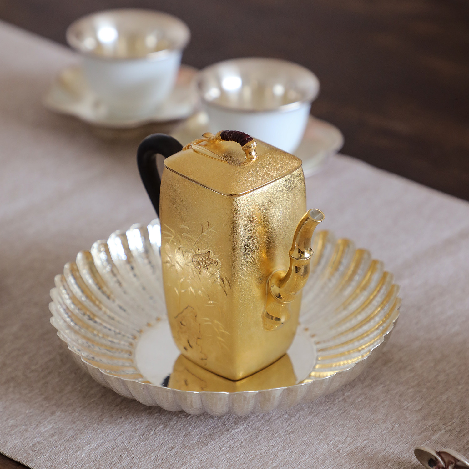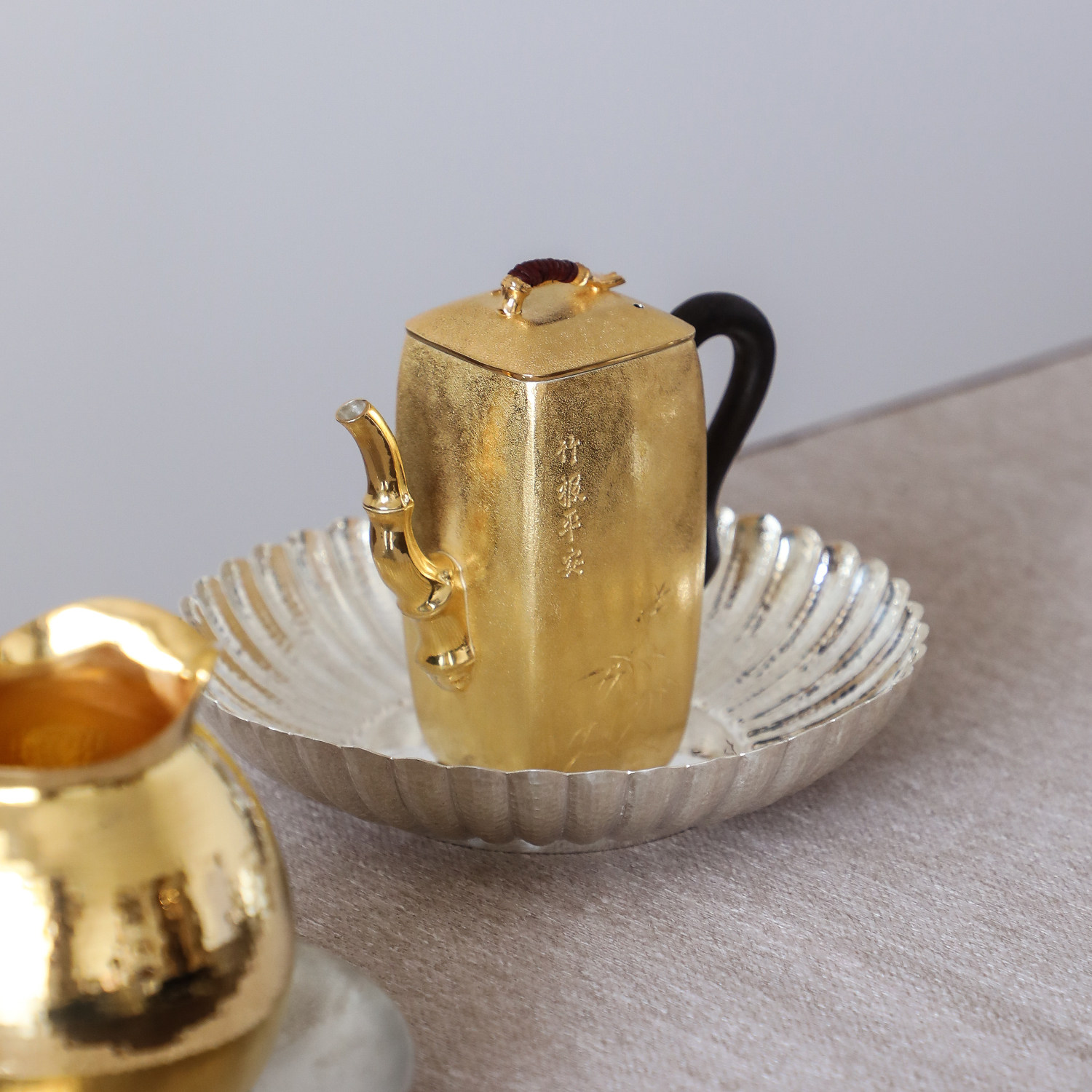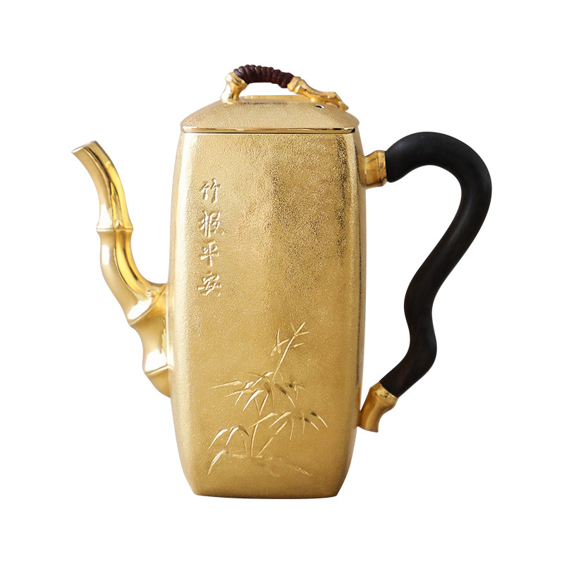 纯银时代鎏金竹报平安泡茶壶足银999纯手工雕刻竹石精致风雅190ml