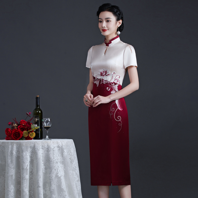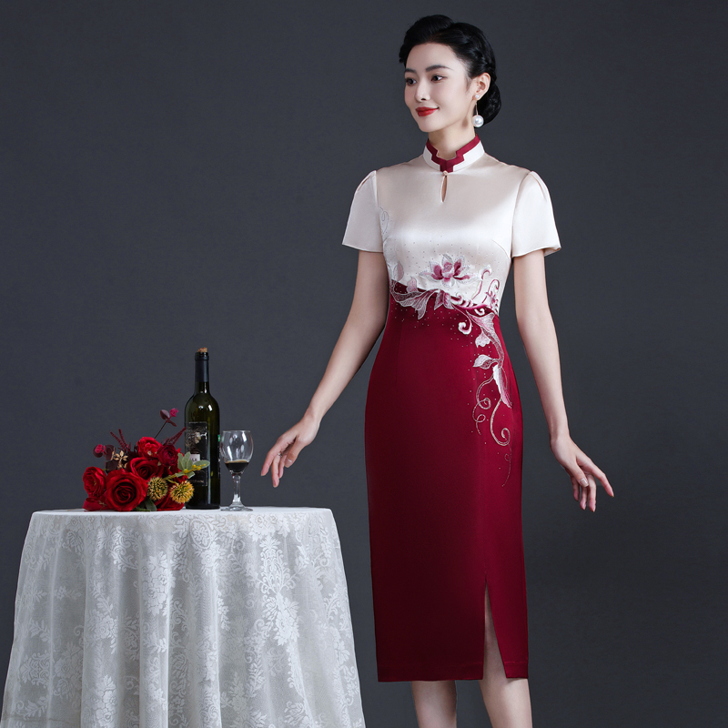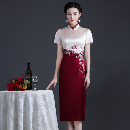 旗袍婚宴妈妈装夏季醋酸缎绣花高贵复古女装日常喜婆婆婚宴晚礼服