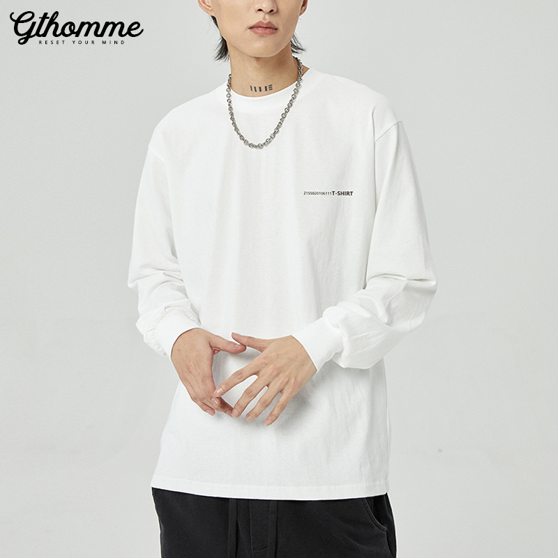 2025春秋男款长袖T恤男宽松圆领印花潮流简约白色青年打底衫外套
