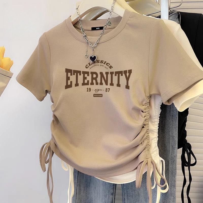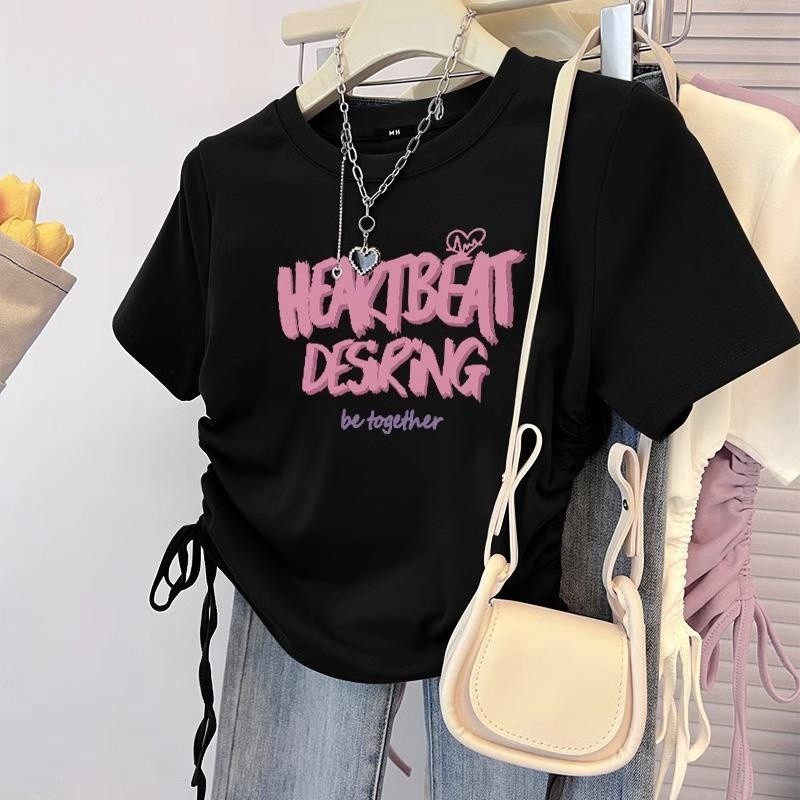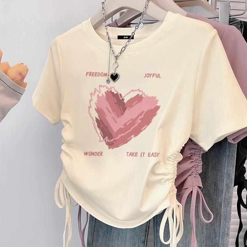 短袖t恤女2025新款夏收腰正肩短款半袖抽绳甜辣小上衣