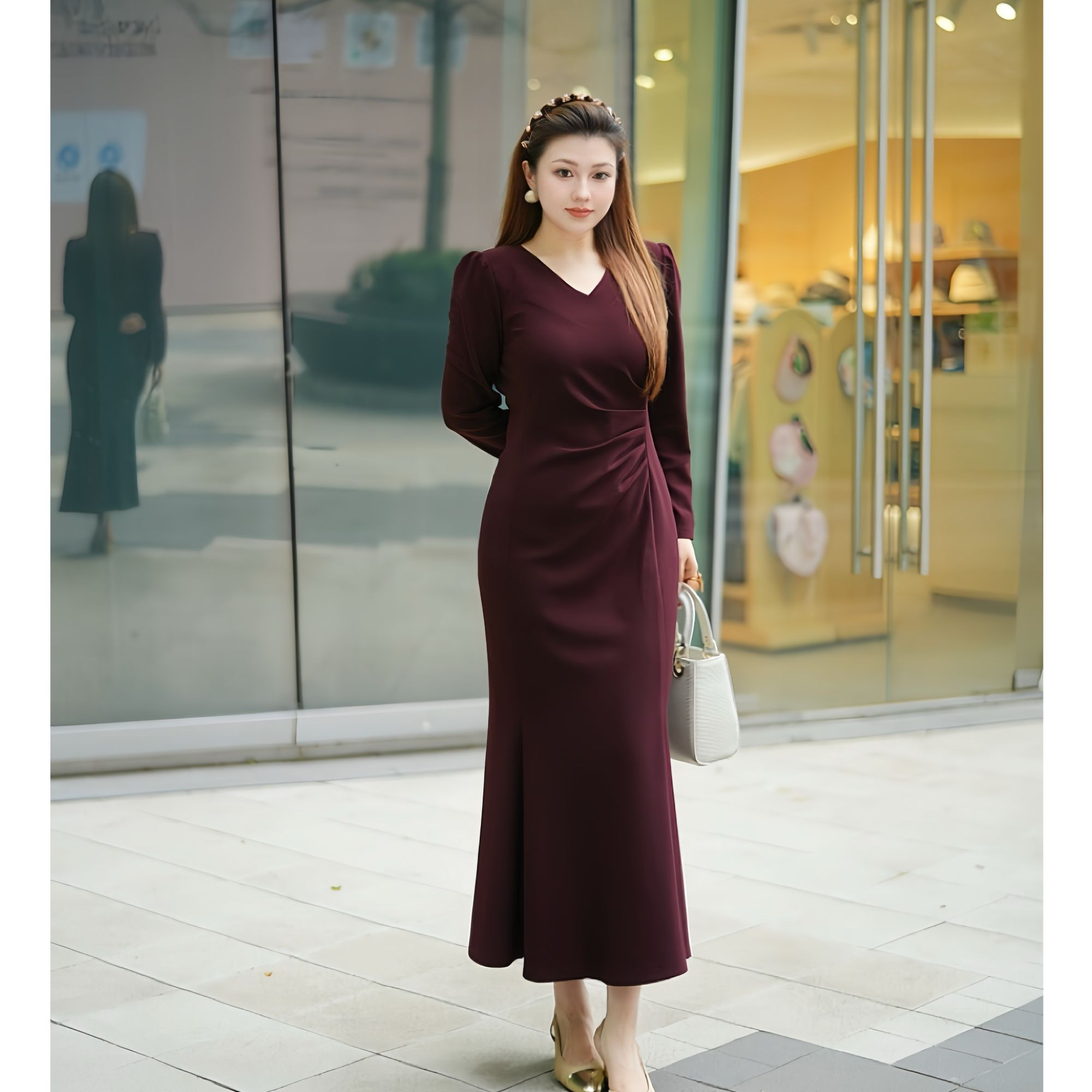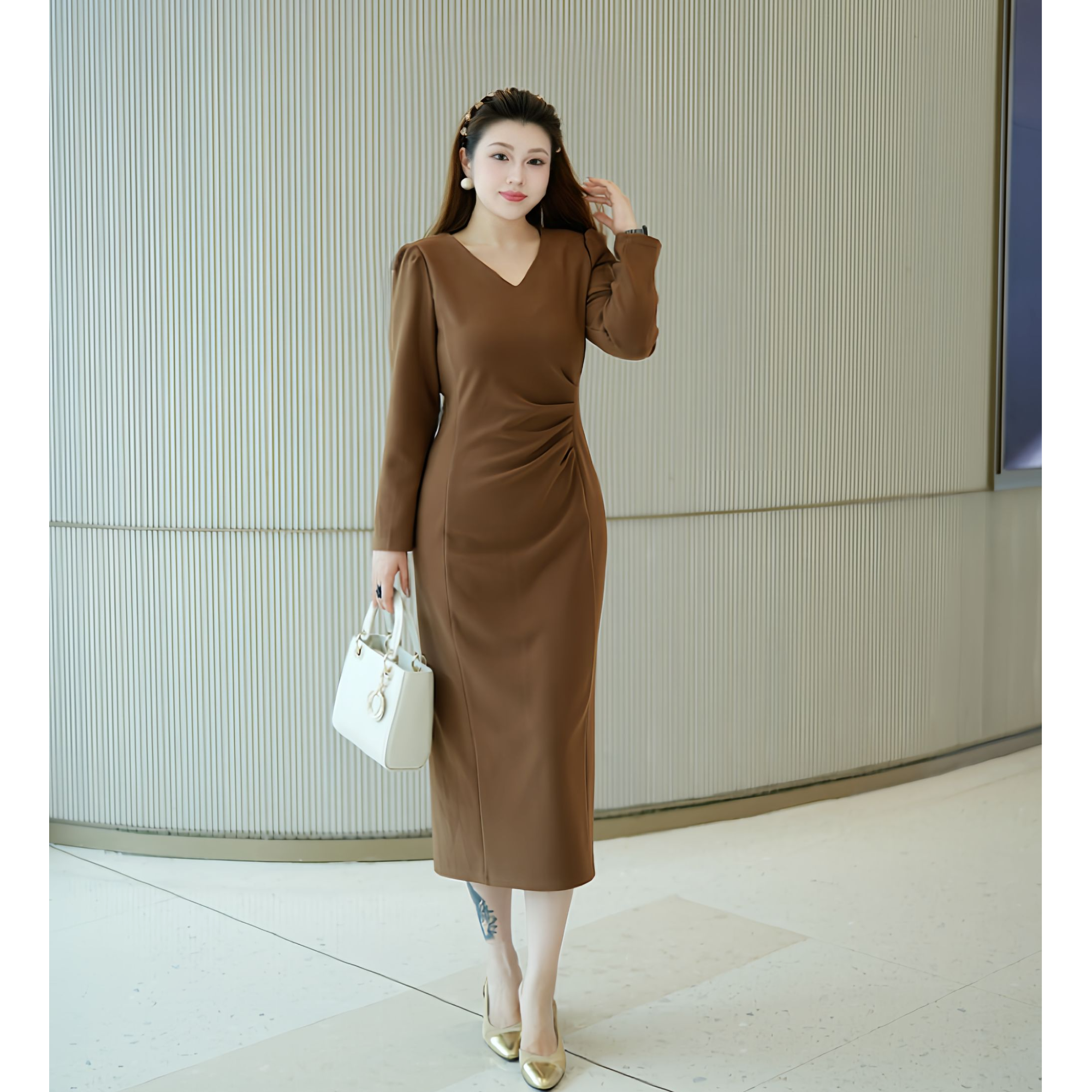 XYD71766/XYD71767秋冬V领捏褶大码女装通勤立裁打底修身连衣裙