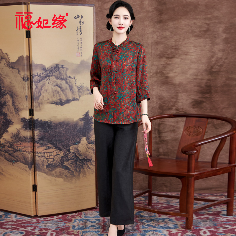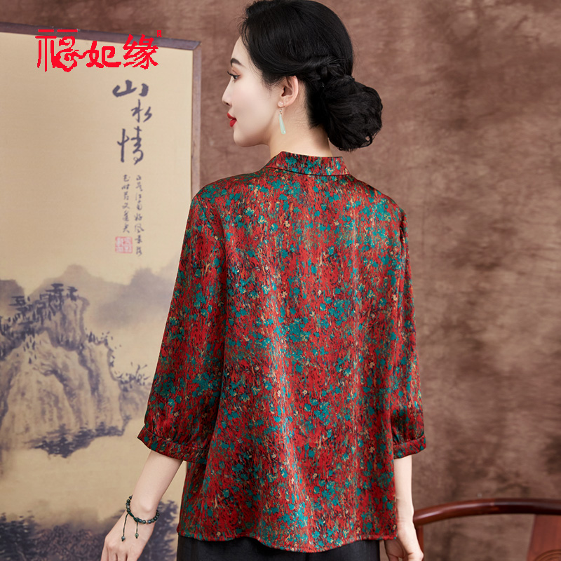 品牌香云纱真丝上衣开衫五分袖碎花妈妈装2025夏季新款桑蚕丝衬衫