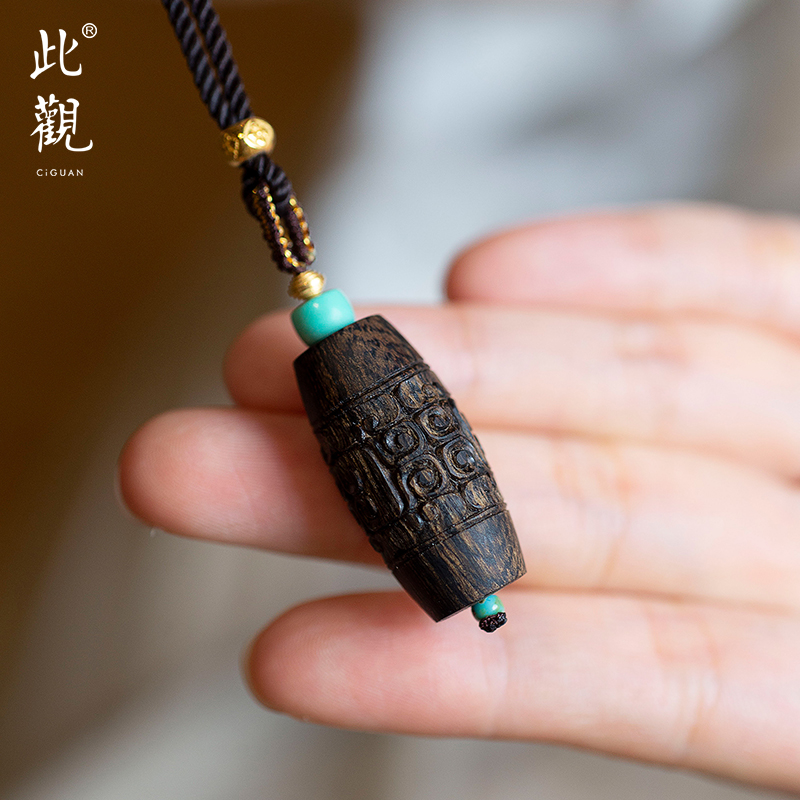 此观真品沉水级达拉干沉香吊坠男士18k金文玩挂件女吊坠转运天珠