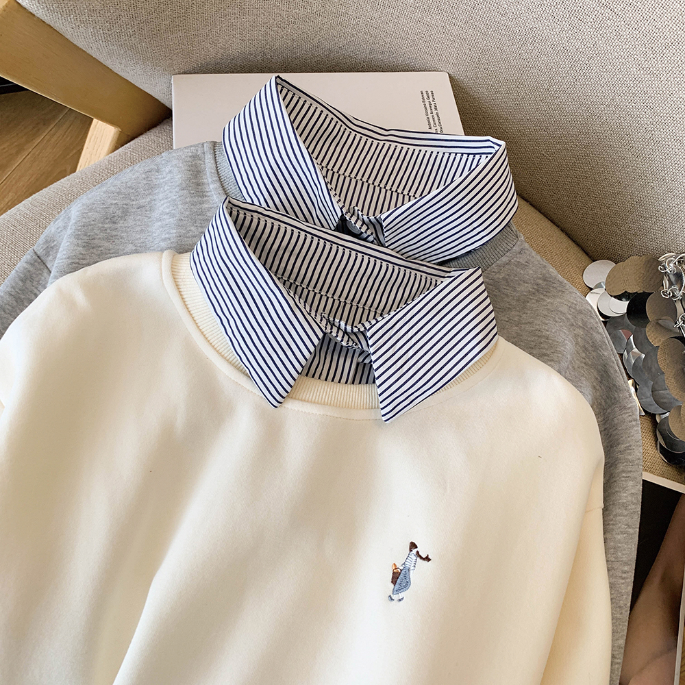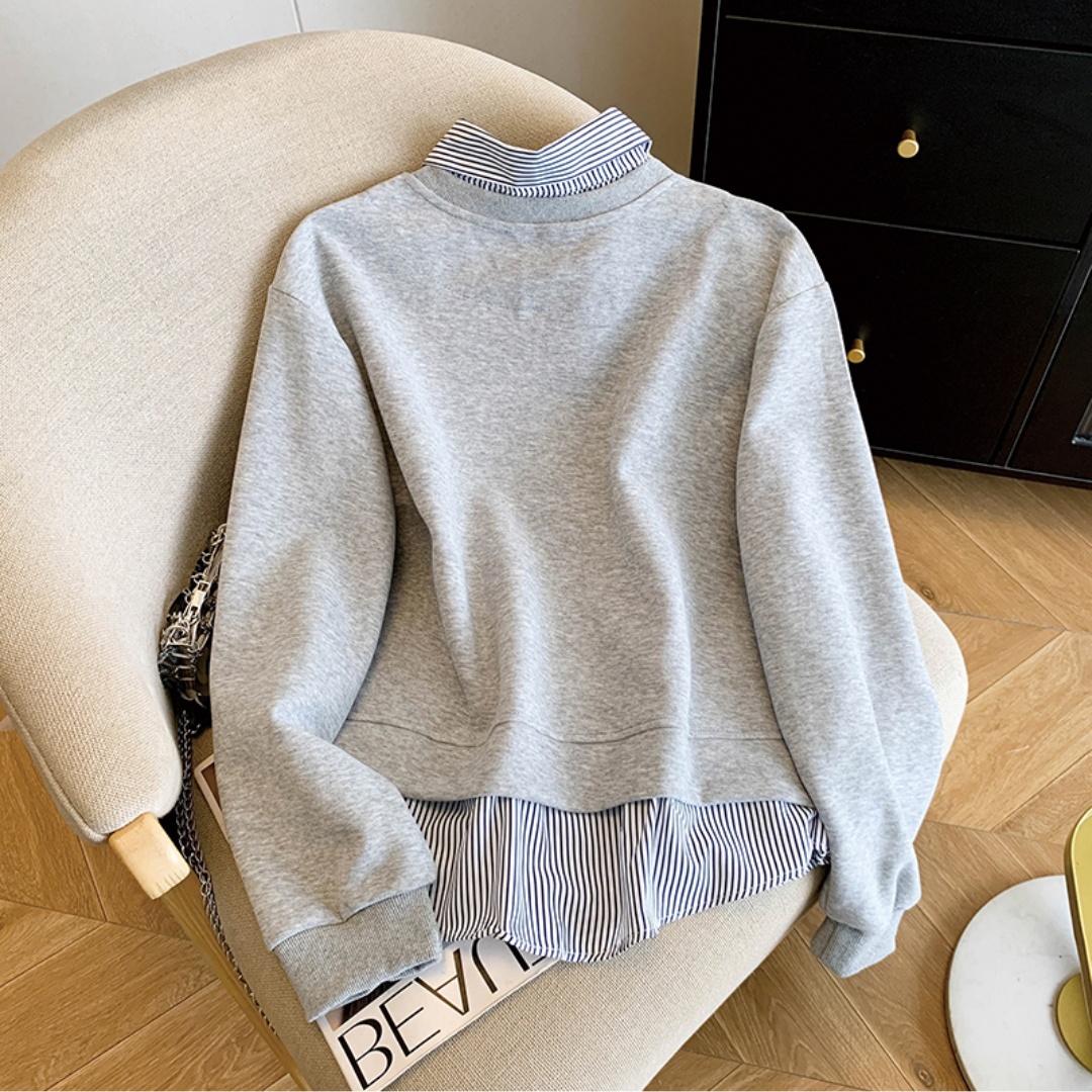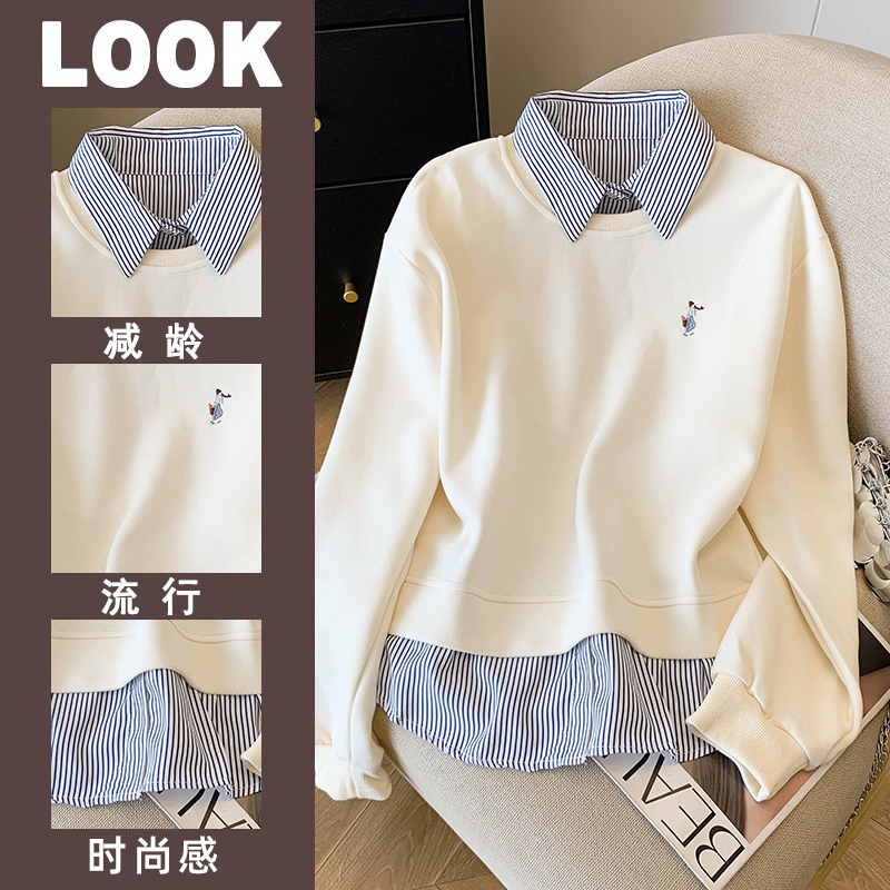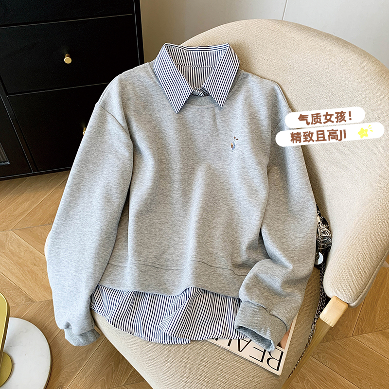 韩系条纹拼接假两件加绒卫衣女