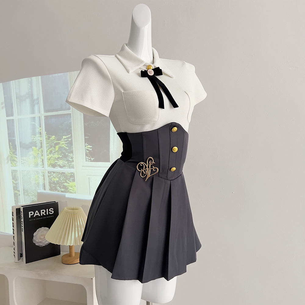 夏季150小个子套装xs鱼骨收腰束腰弹力连衣裙短袖套装学院xxs小码