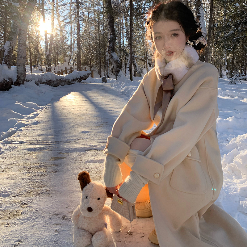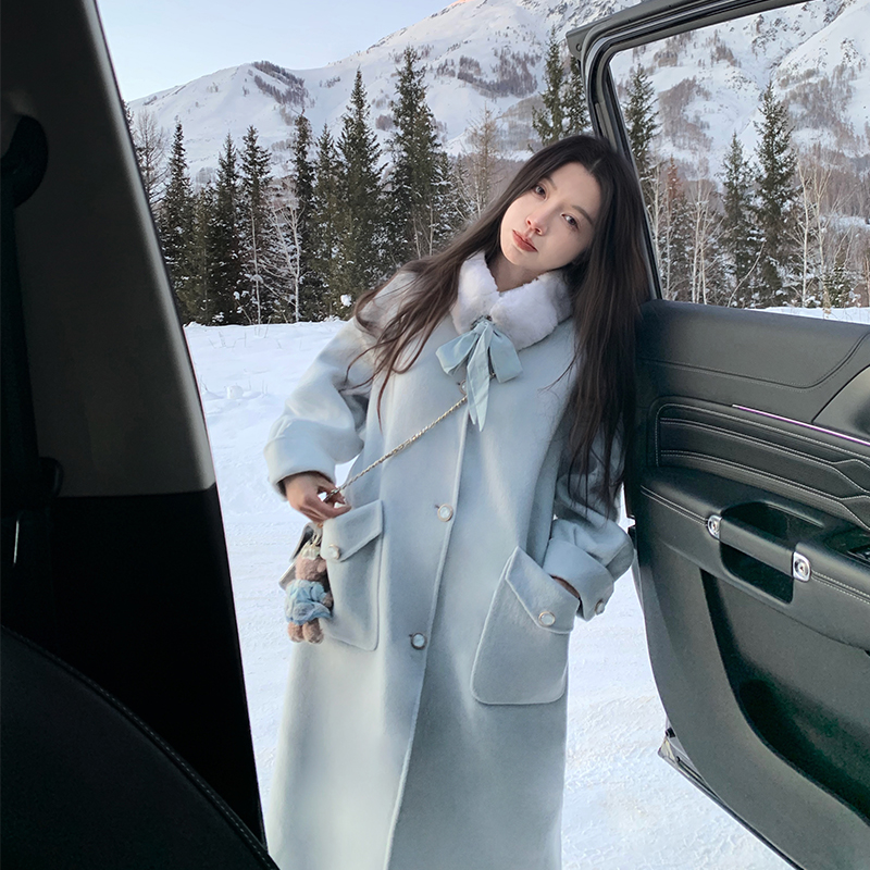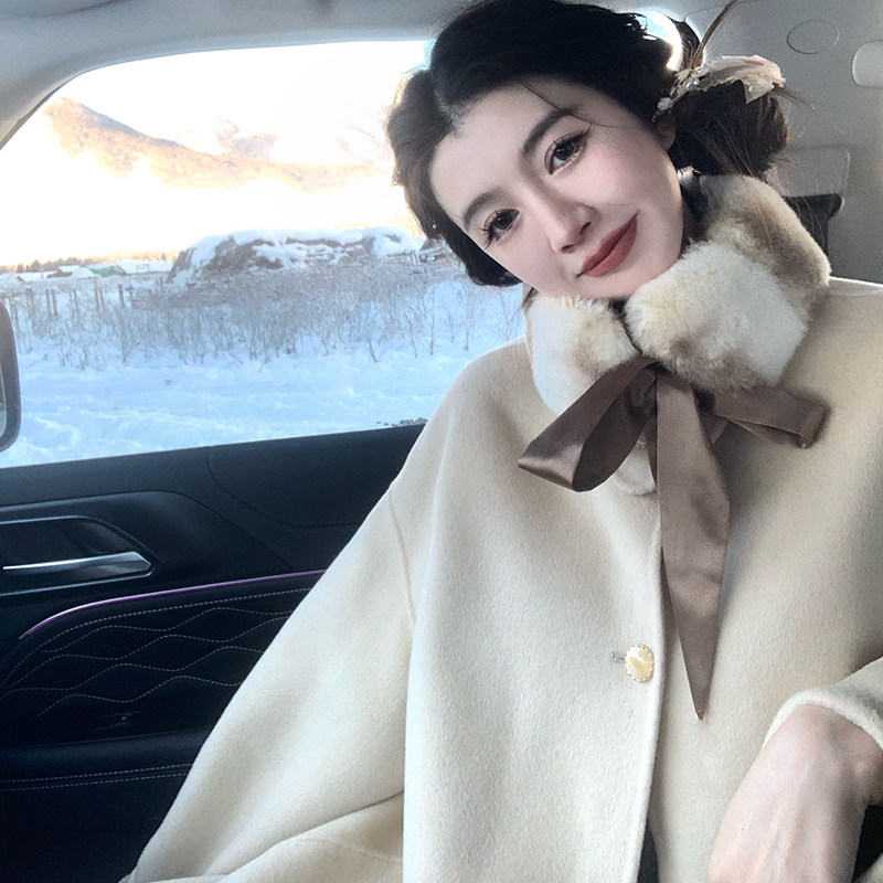 渔小平 纱绘子 龙猫獭兔全羊毛双面呢呢子大衣女秋冬甜美毛呢外套