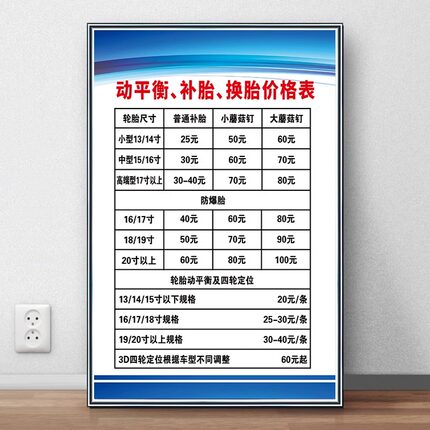 汽车补胎价格表汽修厂常用维修工时表挂牌保养换胎补胎提示告示牌