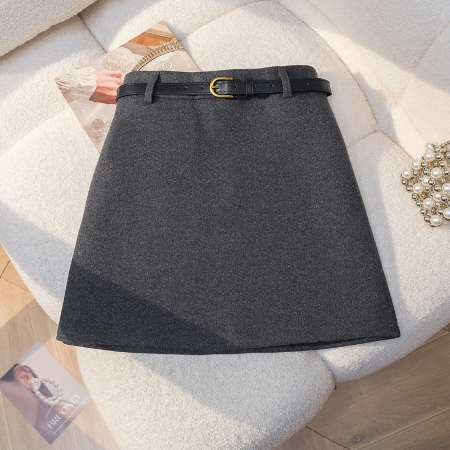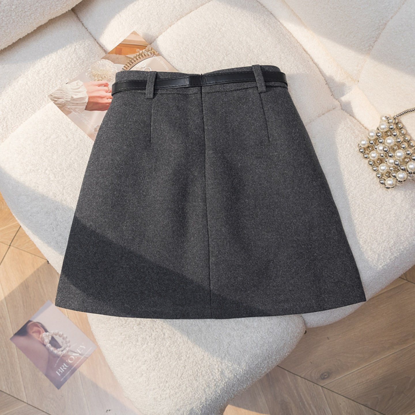 灰色高腰A字毛呢半身裙女2025冬