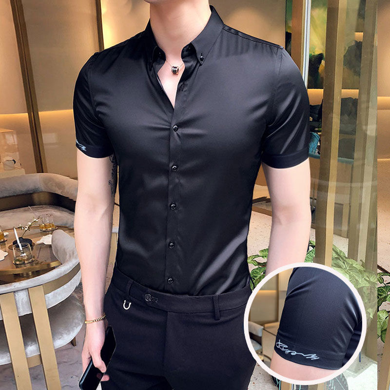 2025夏季新款 英伦免烫免烫短袖衬衫男修身抗皱休闲衬衣男刺绣
