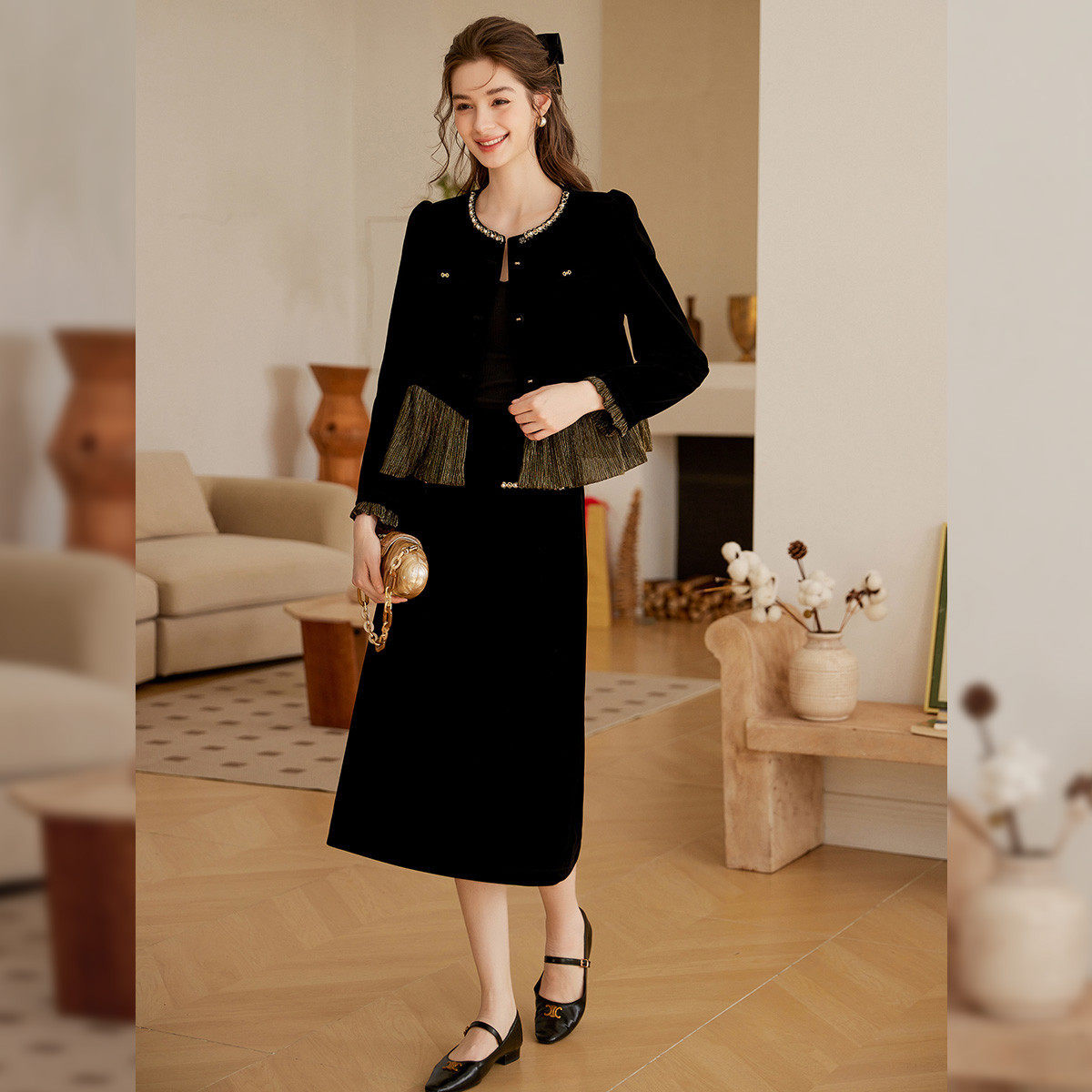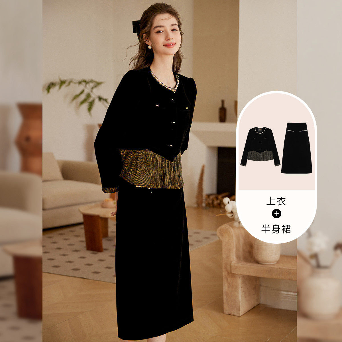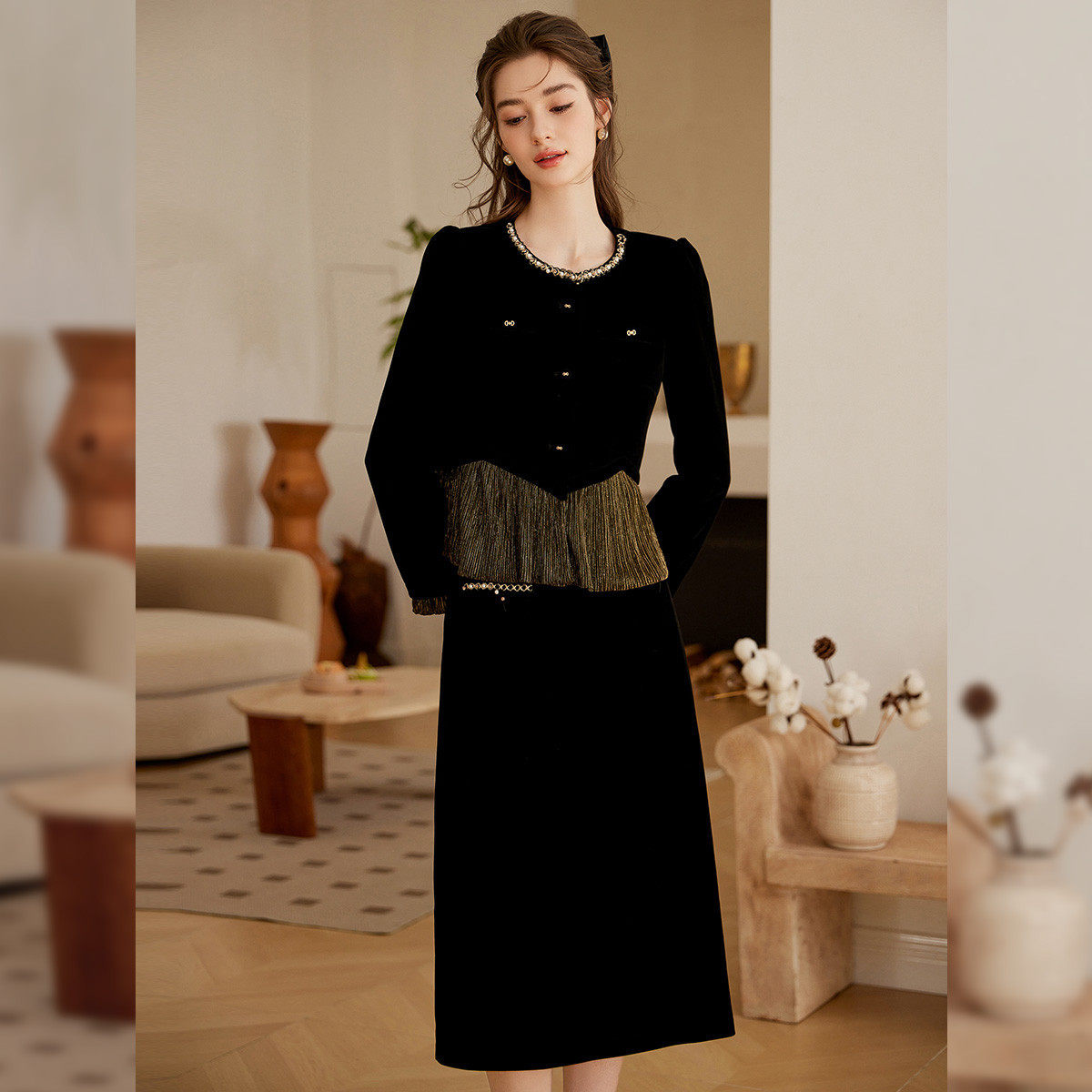 白鹿语黑色气质优雅两件套26春款圆领开衫长袖短外套半身裙套装女