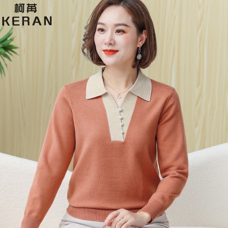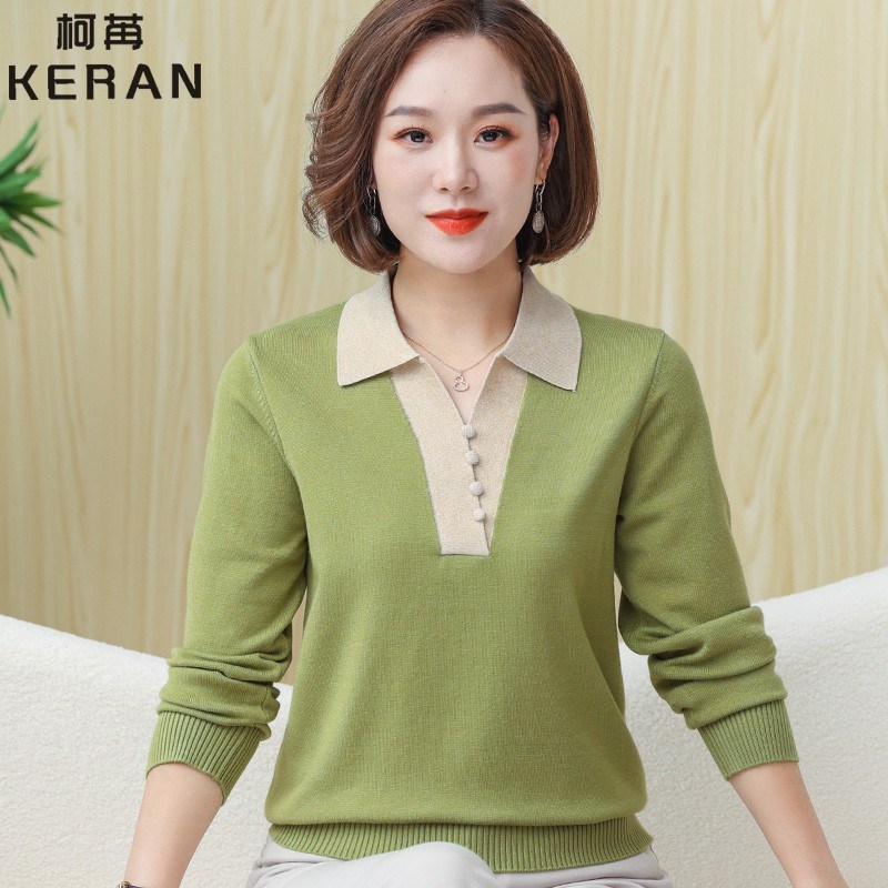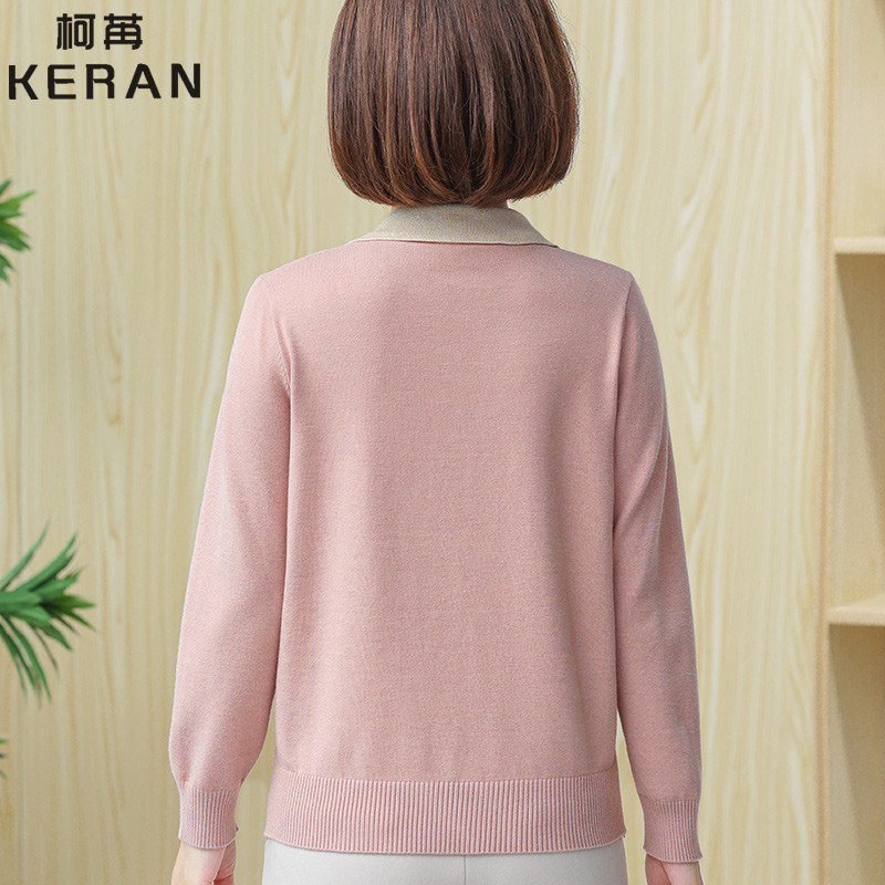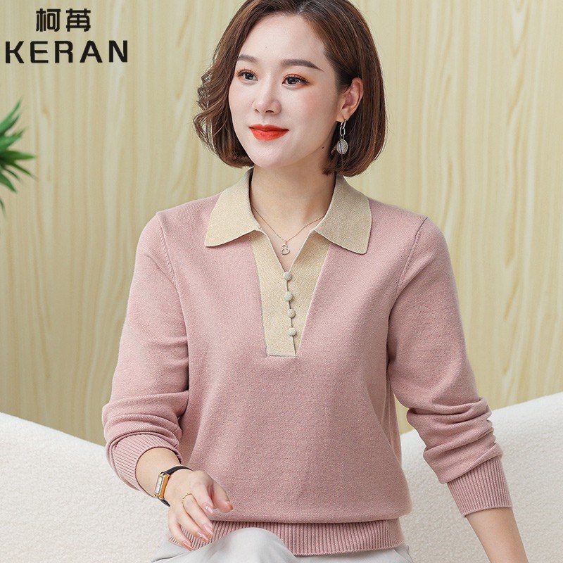 妈妈秋装薄款翻领针织小衫长袖上衣中老年女时尚百搭毛衣两件套