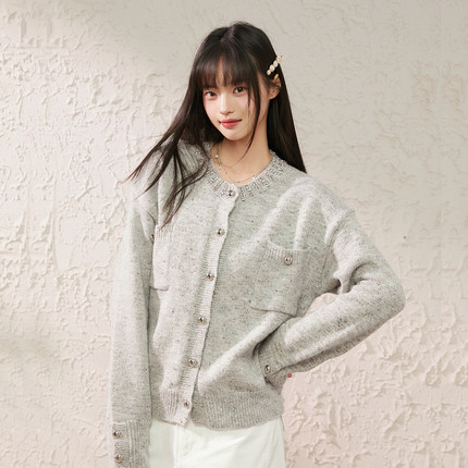 King Prince春季新款灰色彩点镶钻毛衣外套女miu系针织开衫上衣