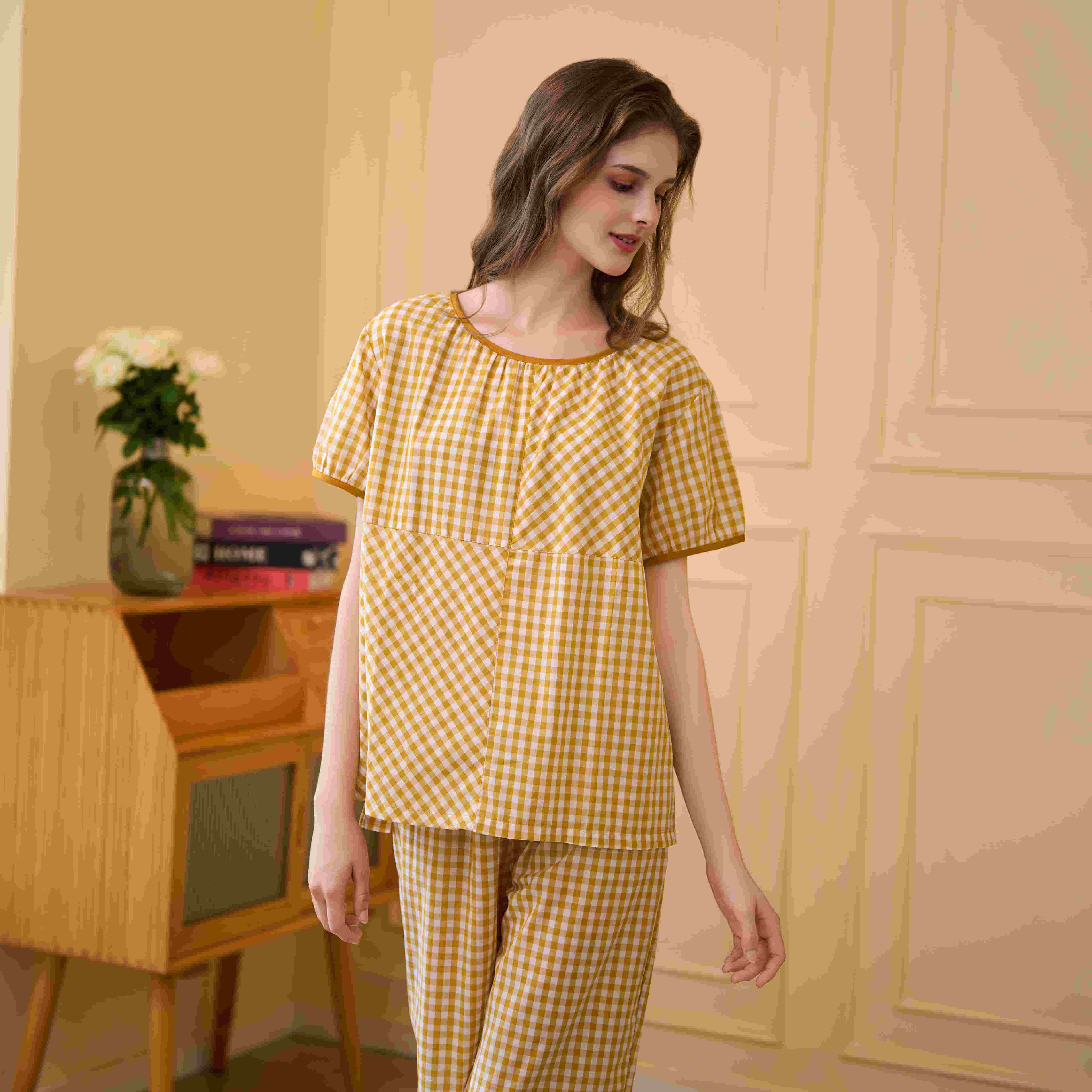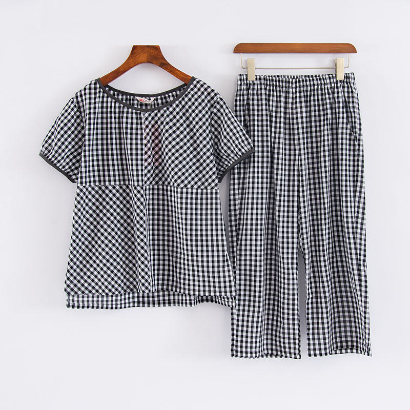 麦可将2025夏季女士短袖七分裤梭织纯棉格子简约套头薄款青年睡衣