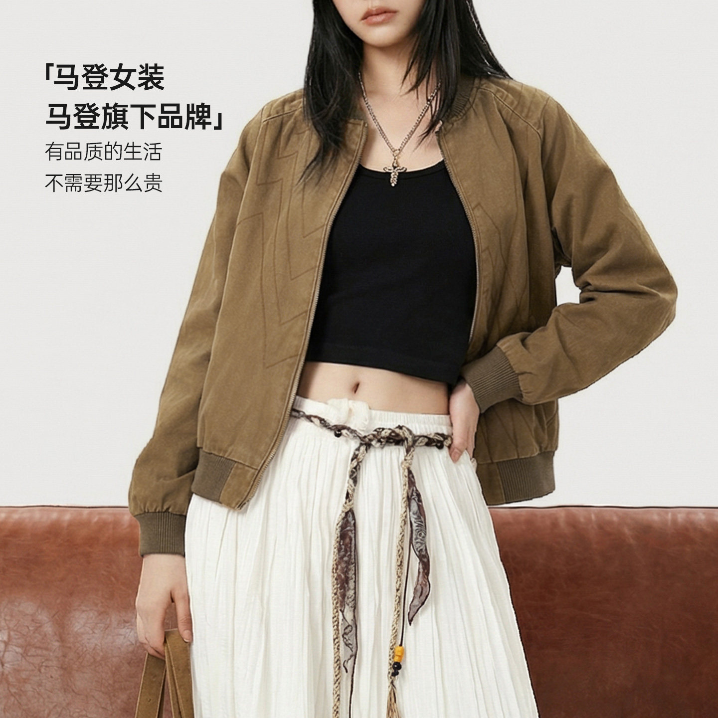 马登美式巴恩风棕色飞行棒球服领正肩工装夹克短款外套上衣女士春