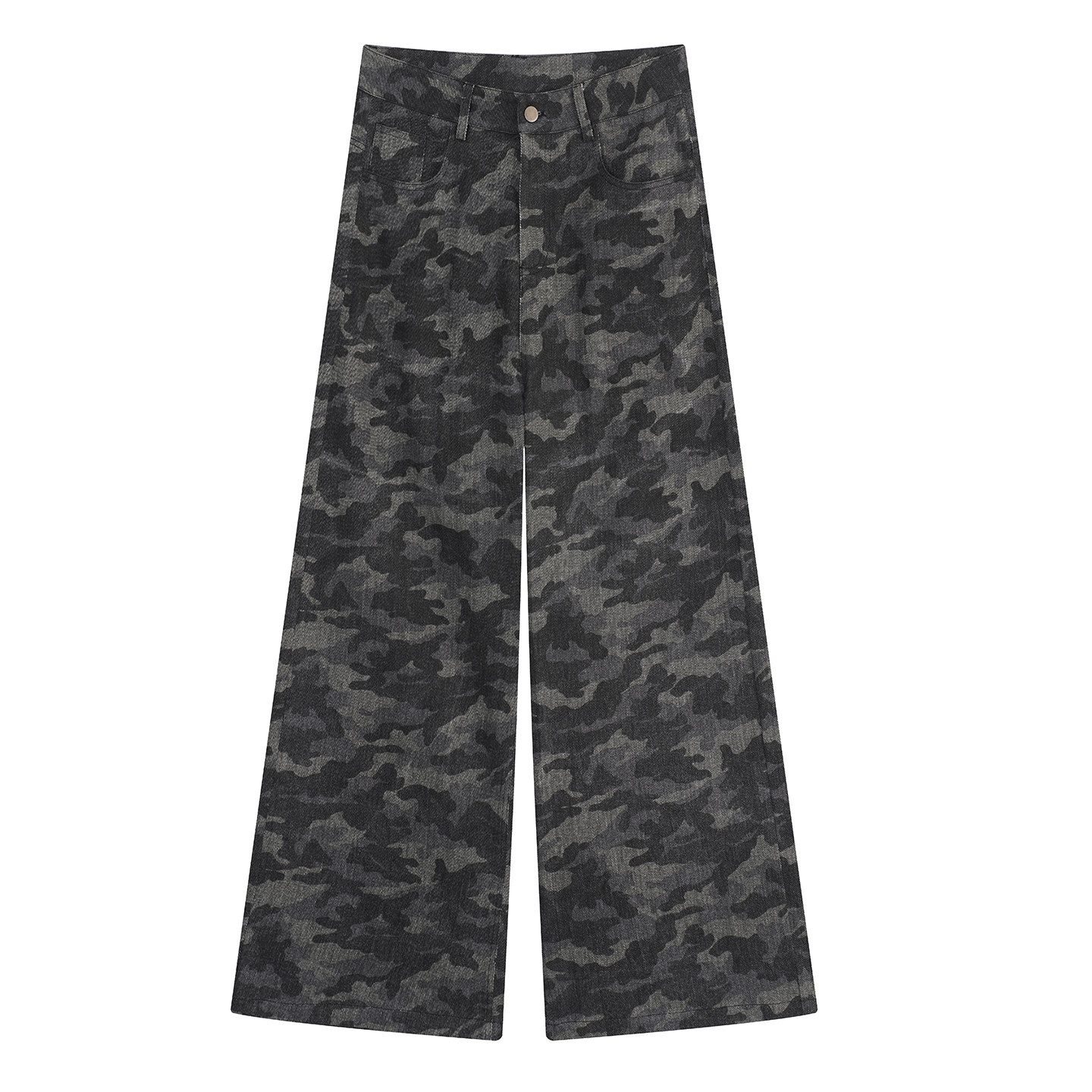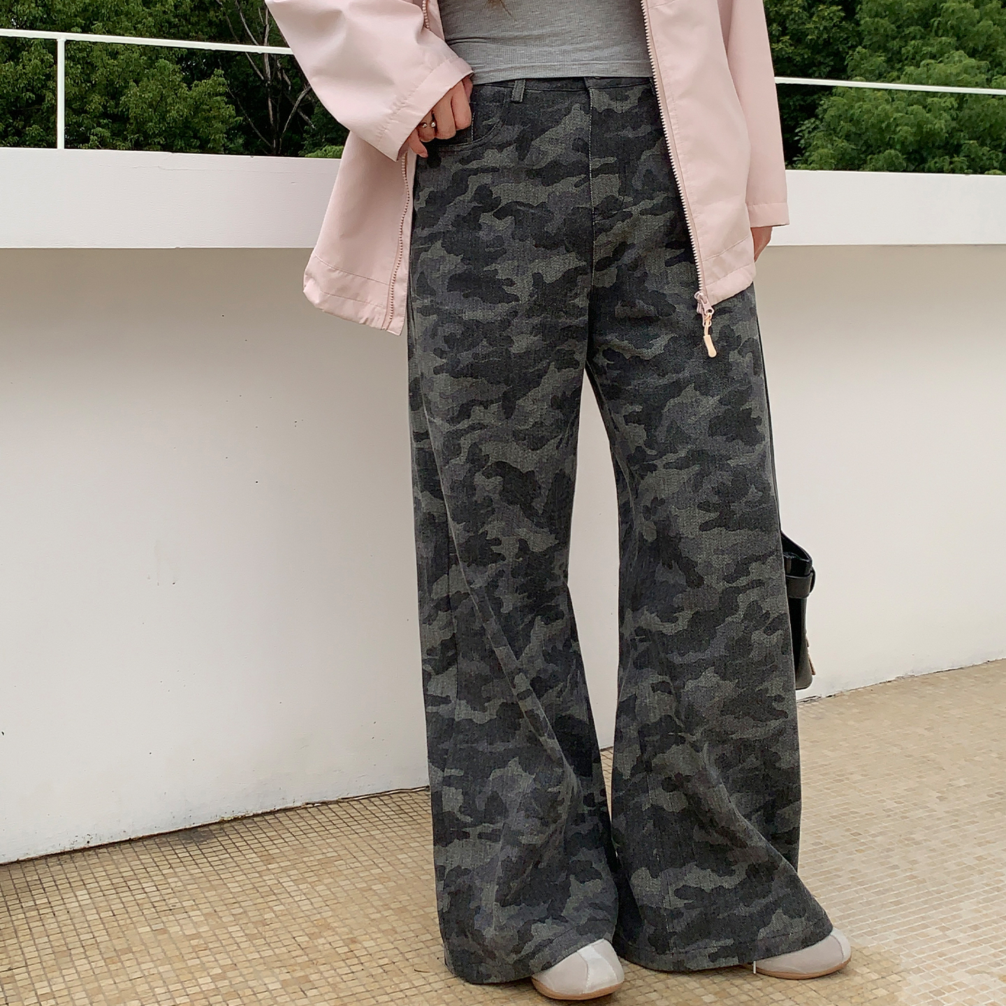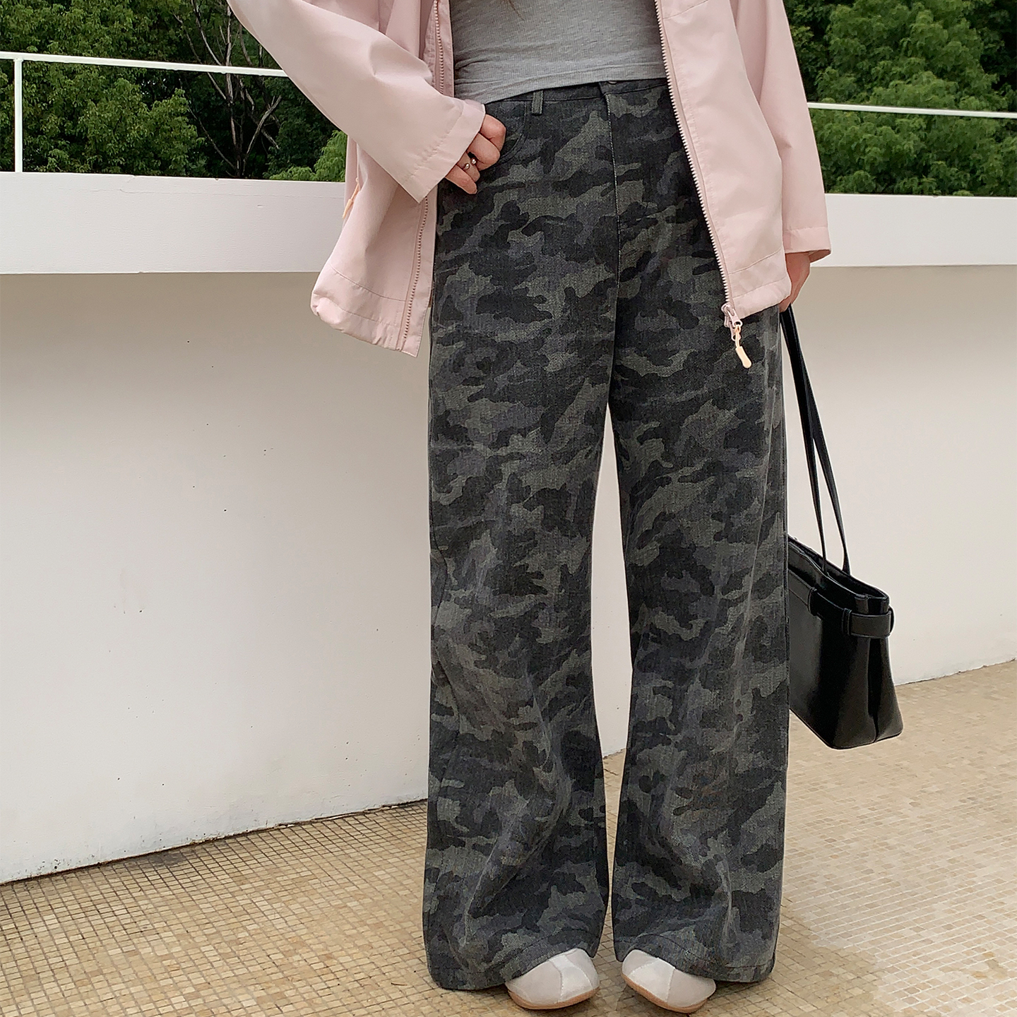 YUZI鱼子黑灰迷彩工装阔腿裤特大码女装复古街头高腰显瘦秋冬胖mm
