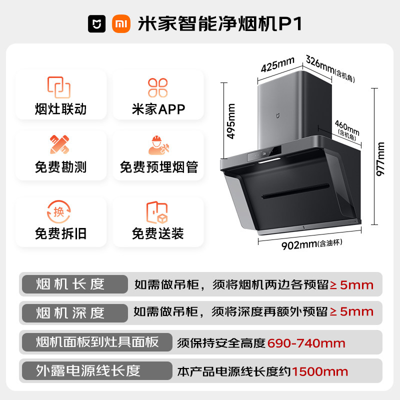 小米官方米家智能净烟机P1家用开放式厨房大吸力变频侧吸抽油烟机